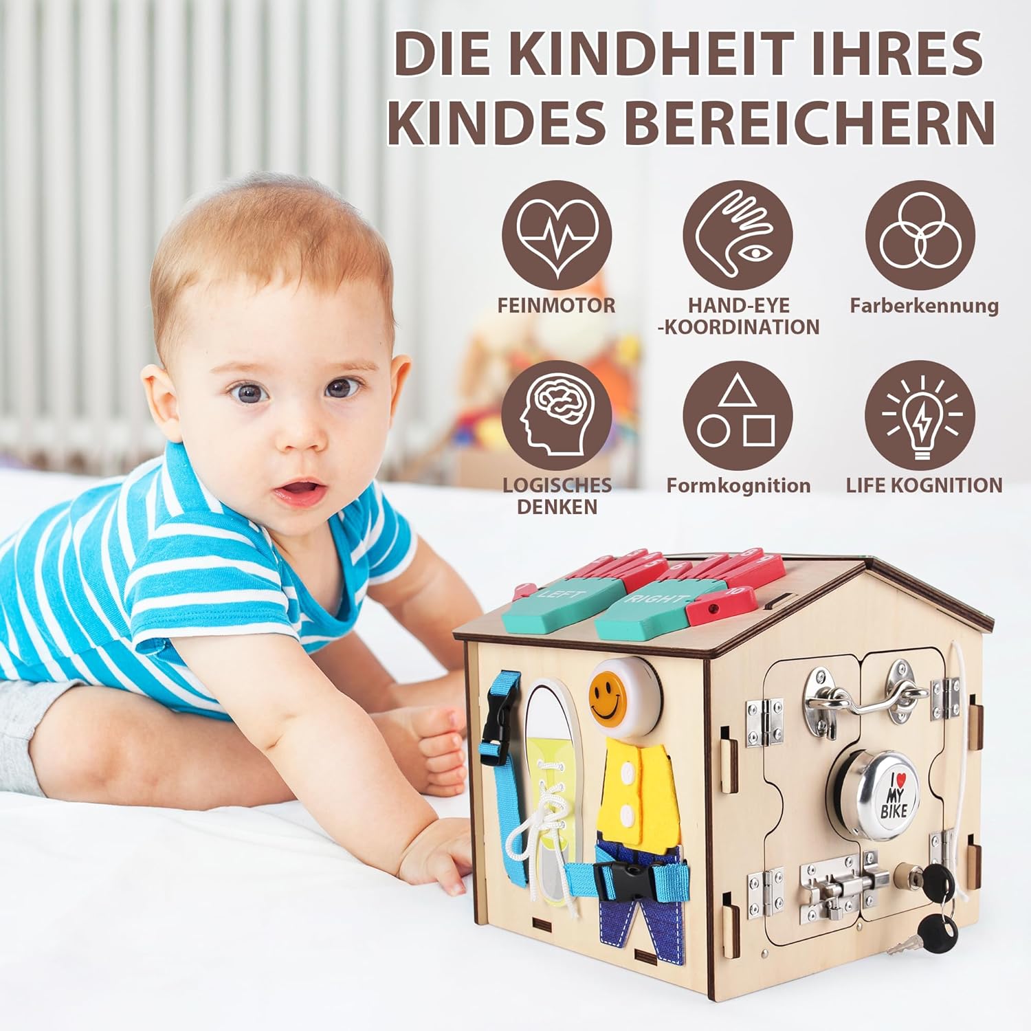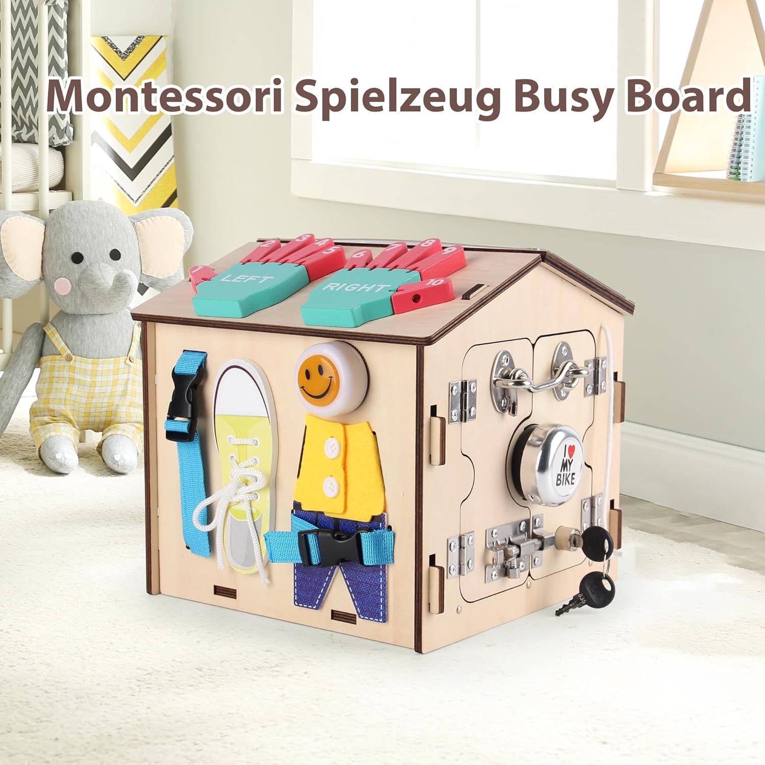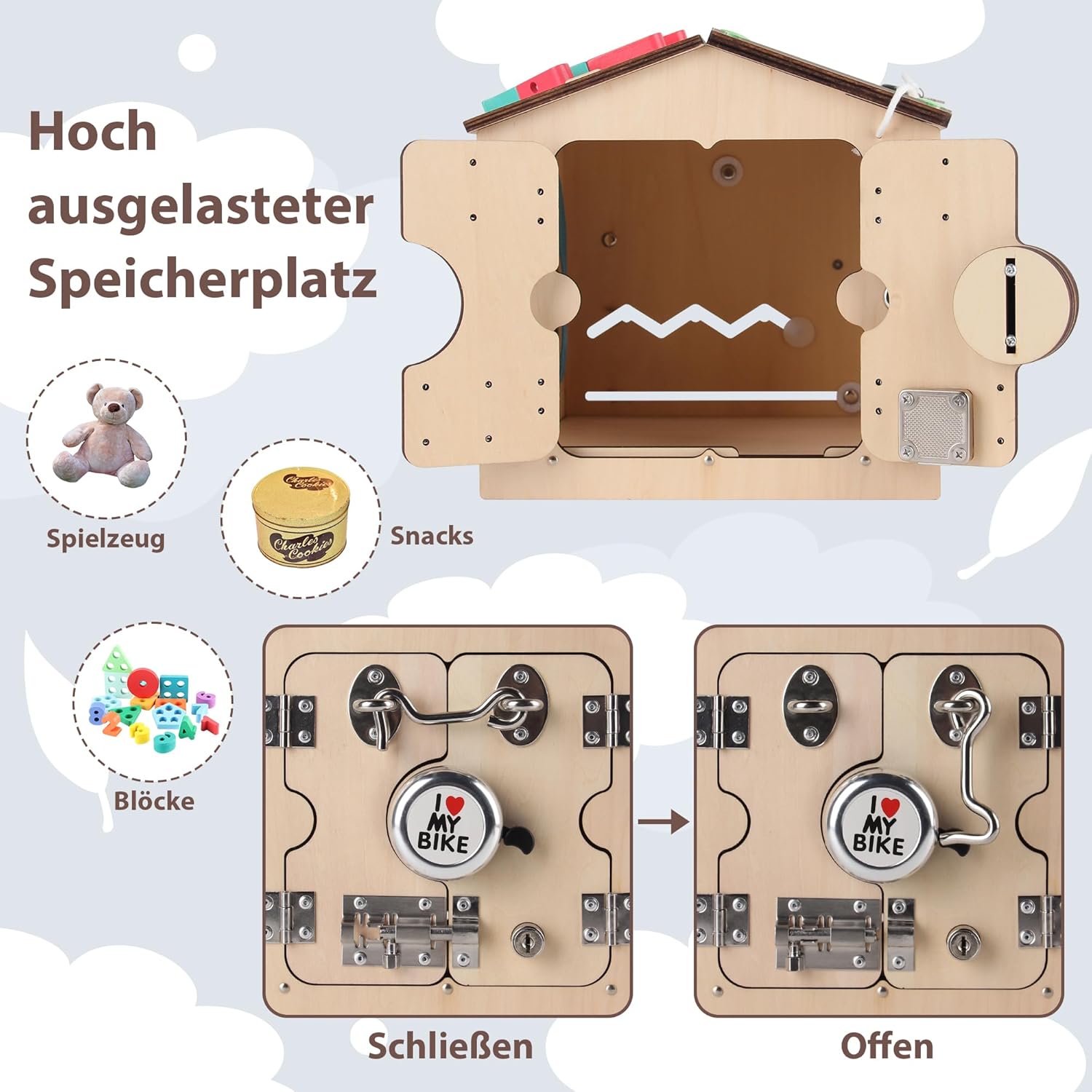 - ????Entwickeln Sie mehr Spielmethoden: Das hölzerne beschäftigte Haus-Spielzeug der Kinder verfügt auch über Kleiderknöpfe, Reißverschluss, Schnürsenkel, Schnalle, Uhr, Verriegelungen, Lichtschalter, Fahrradklingel, Schloss und Schlüssel. Mit diesem beschäftigten pädagogischen Spielzeug können Sie Ihren Kindern verschiedene Lebensfähigkeiten beibringen, ihnen helfen, gute Gewohnheiten zu kultivieren, ihre kognitiven Fähigkeiten und praktische Lebensfähigkeiten zu erweitern.