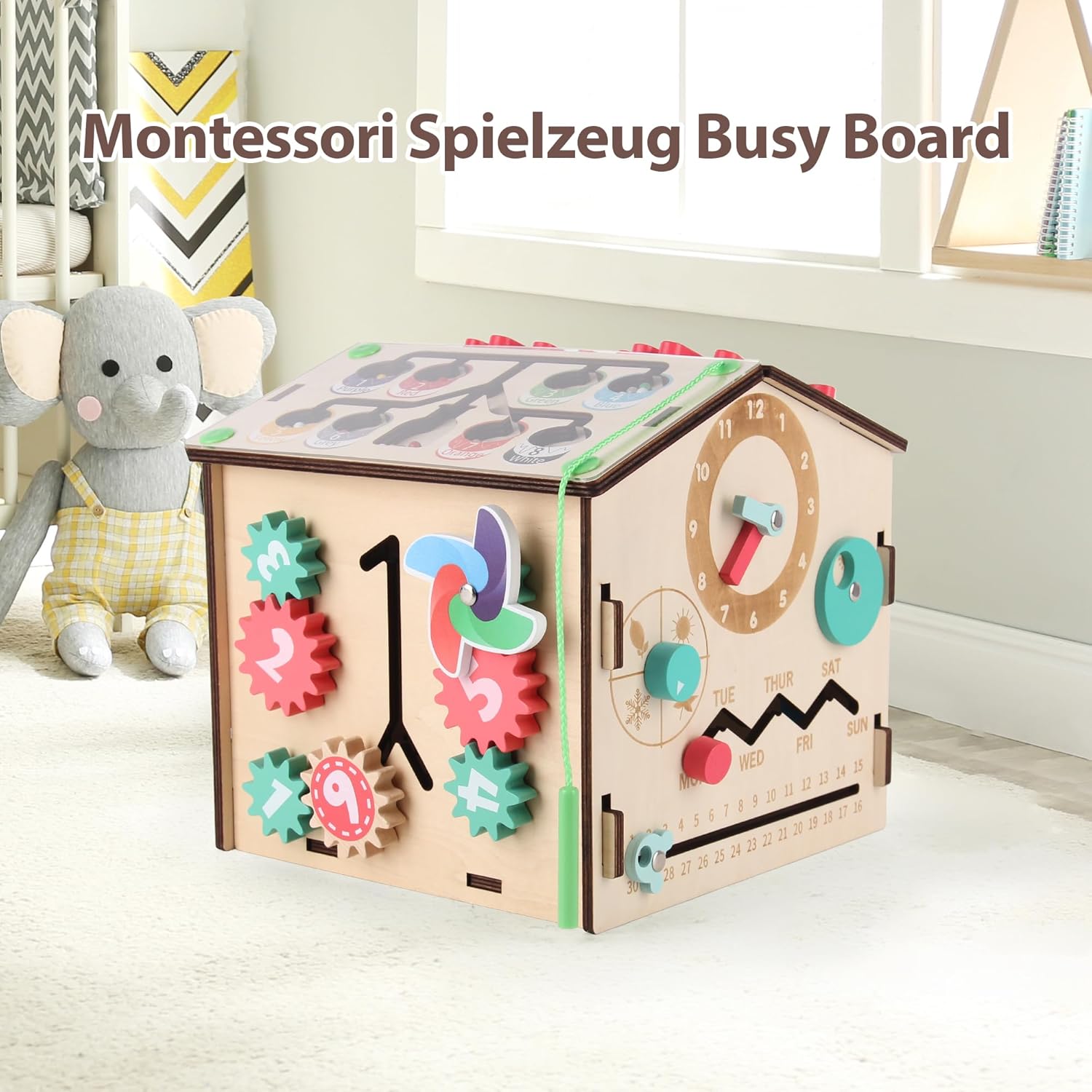 - ????Multifunktionales Busy House: Dieses hölzerne Busy Board ist ein Spielzeug für Kinder ab drei Jahren. Es hat sechs Gesichter Bretter mit 17-pädagogischen Spielen, einschließlich Zahnräder, Windmühle, magnetische Farbe und Zahlen Labyrinth, Saison- und Wettererkennung, Zahlen usw. Kleinkinder frühes Lernen Spielzeug helfen, die Farbe, Mathematik, Formkognition, Versammlungsfähigkeiten zu verbessern, helfen, ihre Hand-Augen-Koordinationsfähigkeiten zu verbessern, entwickeln Feinmotorik.