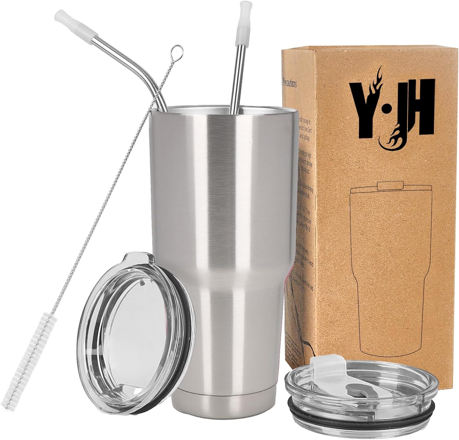 Y·J&H Doppelwandiger Vakuum Isolierbecher Autobecher Edelstahl Reiseflasche Thermobecher Coffee to go mit 2 Spritzwassergeschützten Deckeln 2 Strohhalmen Tubenbürste BPA Frei