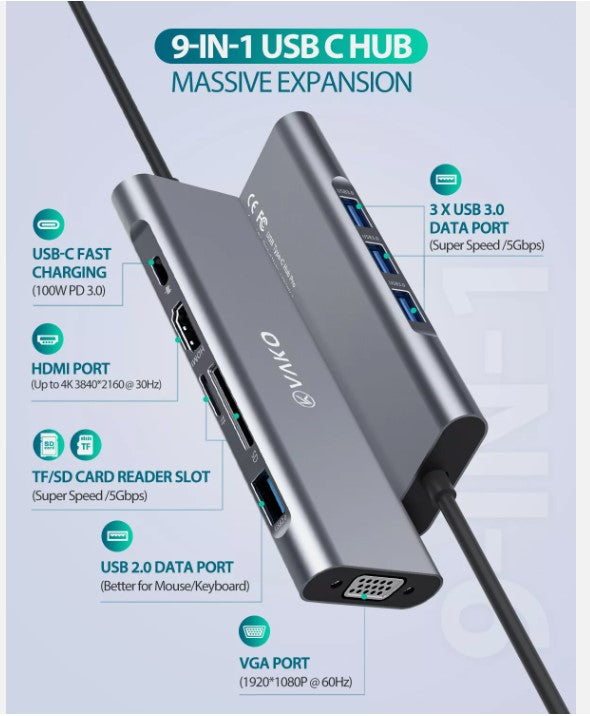 VAKO USB C Hub 9 IN 1 Multiport Adapter DMI VGA SD-Karte inkl. Micro USB 3.0 2.0