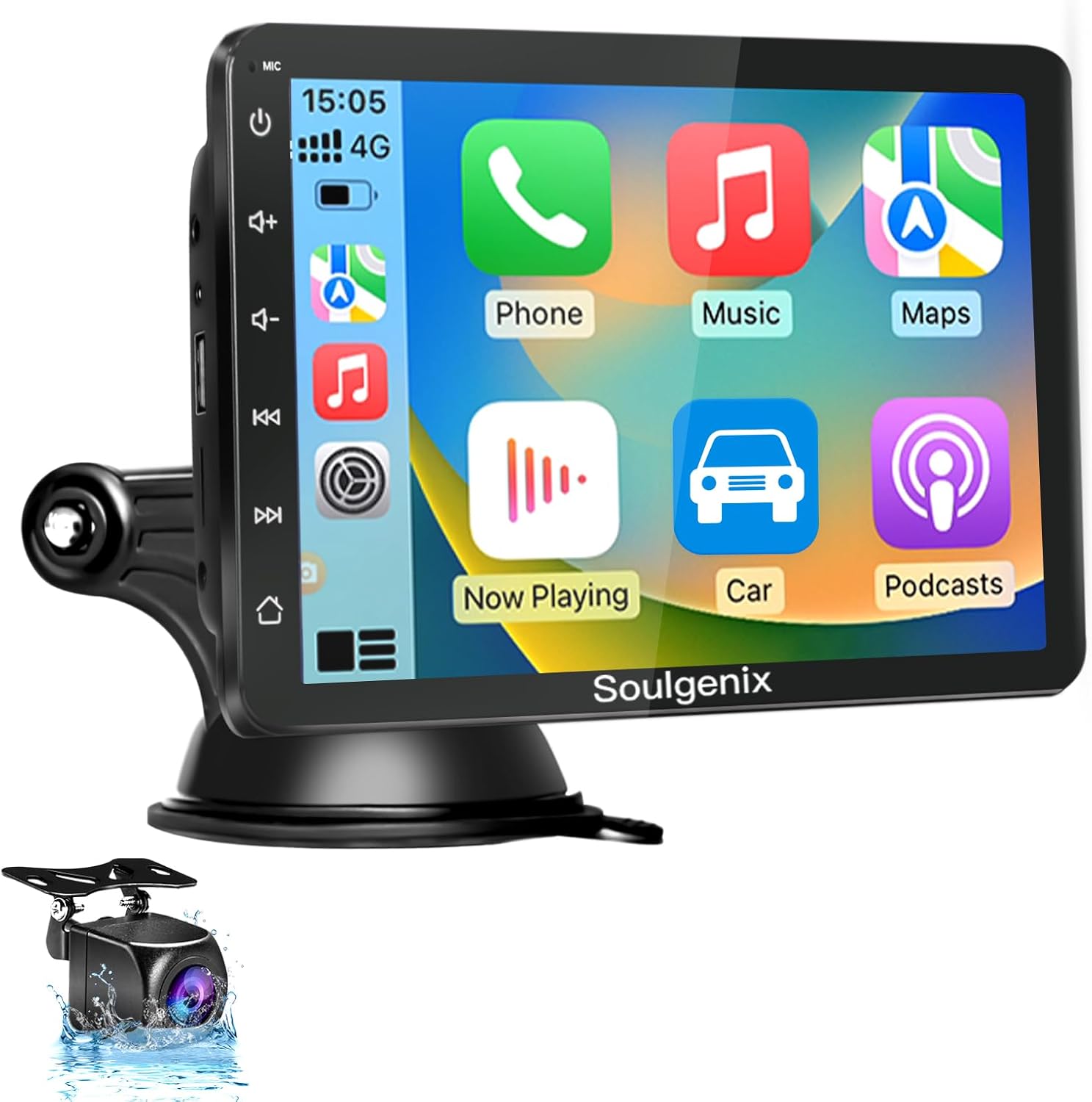 Wireless Apple CarPlay&Android Auto Display Portable Doppel Din Radio, Tragbares Autoradio 7 Zoll HD IPS Touchscreen,GPS Navi, Bluetooth, Rückfahrkamera, Mirror Link, FM, AUX CarPlay Display, 12-24V