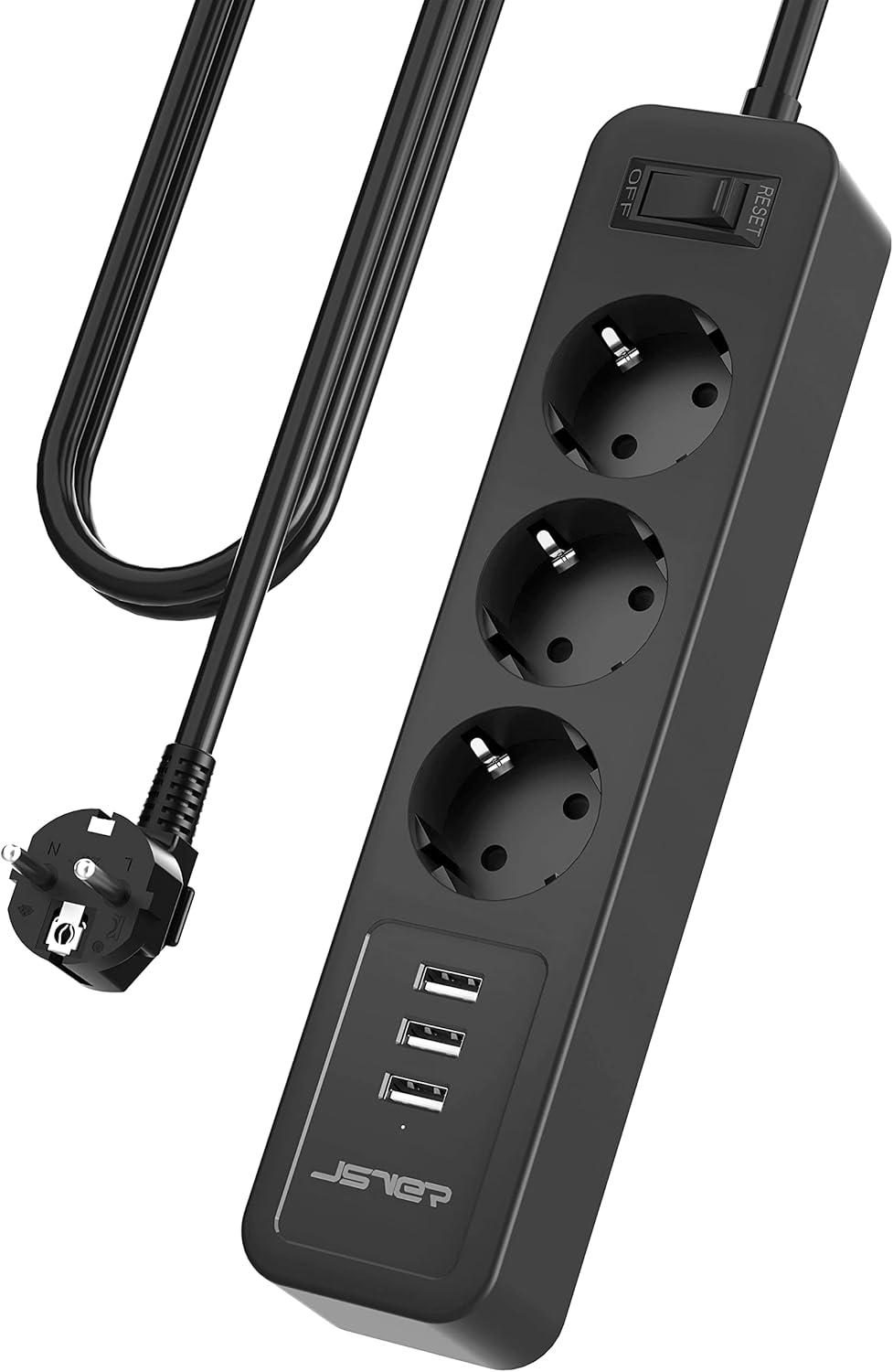 JSVER Steckdosenleiste Mehrfachsteckdose 3 Fach mit 3 USB 3M Schwarz