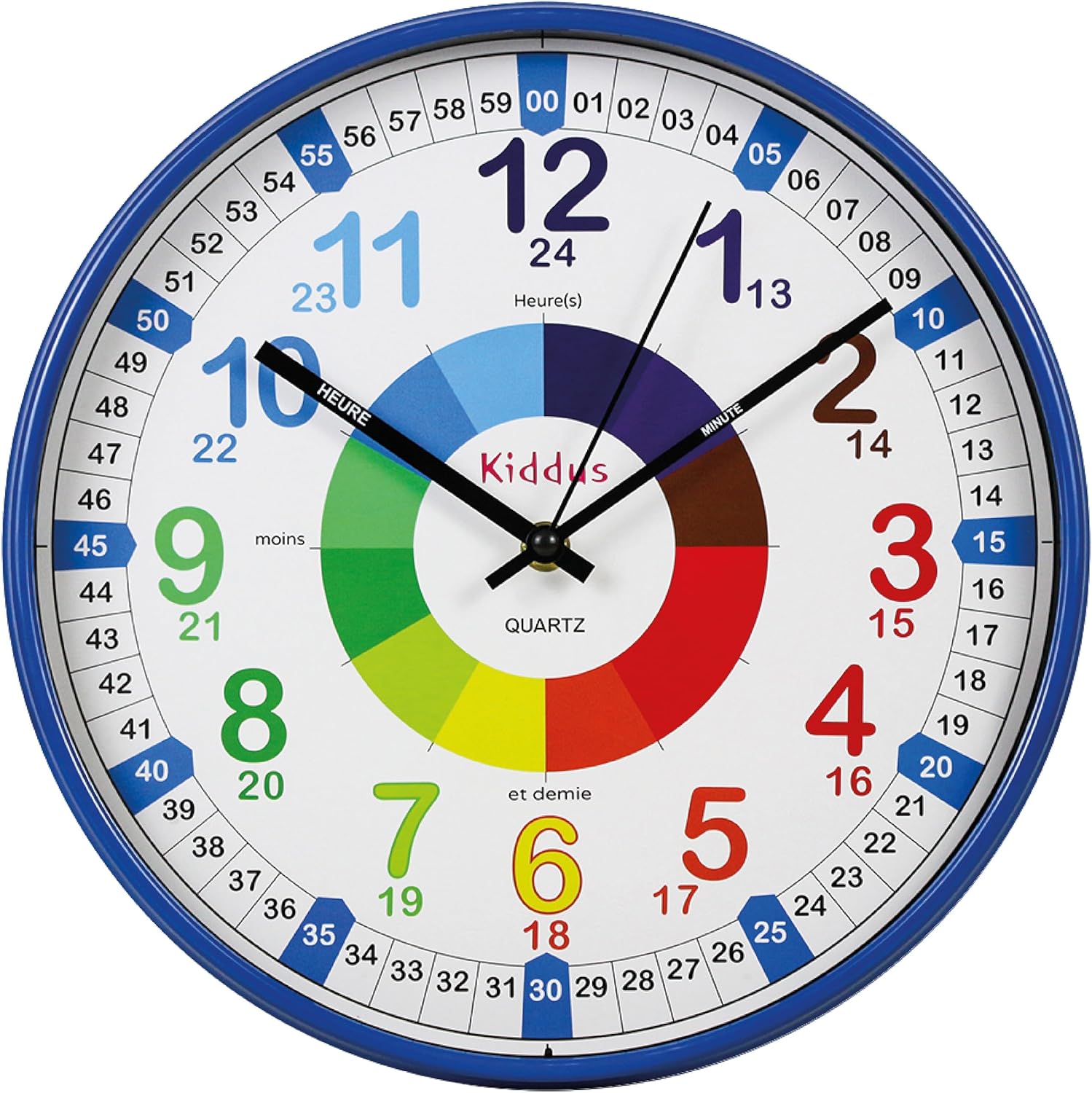 Kiddus Time Teacher Wanduhr für Kinder. 30cm Analoger Zeitlehrer mit Zeit Lernübungen. Stilles Uhr. Viele Sprachen. Blau