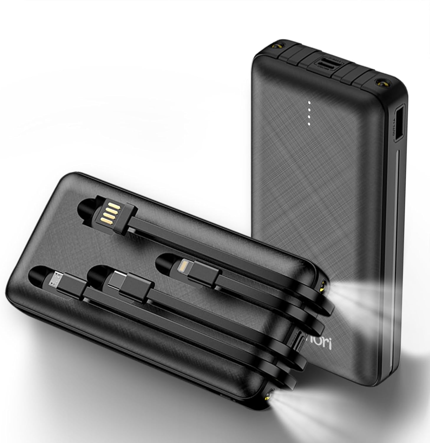 20000 mAh Power Bank 4 Ausgänge 3 Eingänge,Tragbares Ladegerät mit eingebauten Kabeln