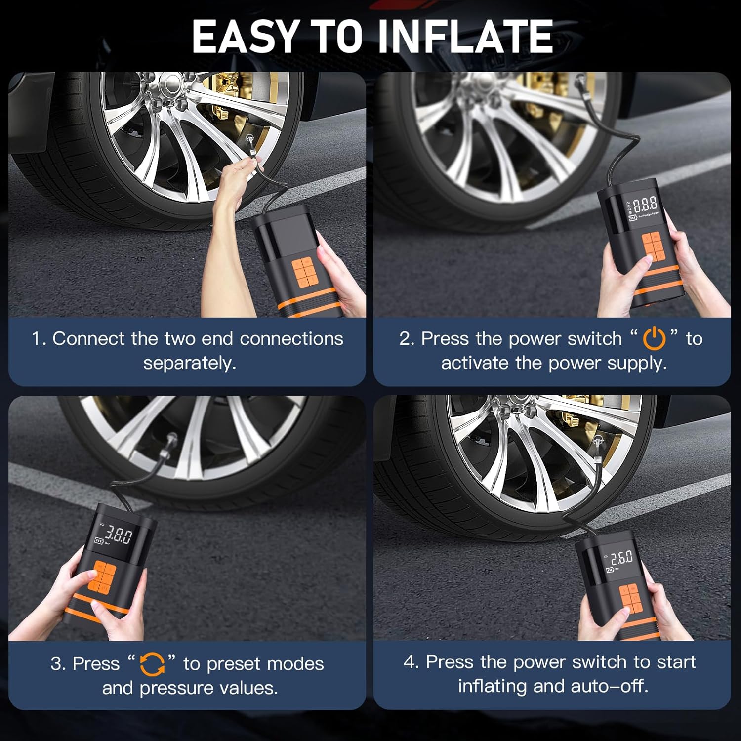 【4 Betriebsmodi】: Vier Lademodi können jederzeit eingestellt werden, wodurch Autos, Motorräder, Motorräder und Bälle aufgepumpt werden können und diese gestoppt werden, wenn die Lademodi voll sind, bevor sie betrieben werden können. Der maximale Druck der Luftkompressoren beträgt 150 PSI, was ausreichend war, um die vollständige Konformität zu gewährleisten. Dieser schweißt sich mit vier Druckwerten PSI, KPA, BAR, KG/CM² einfach per Knopfdruck umschalten.