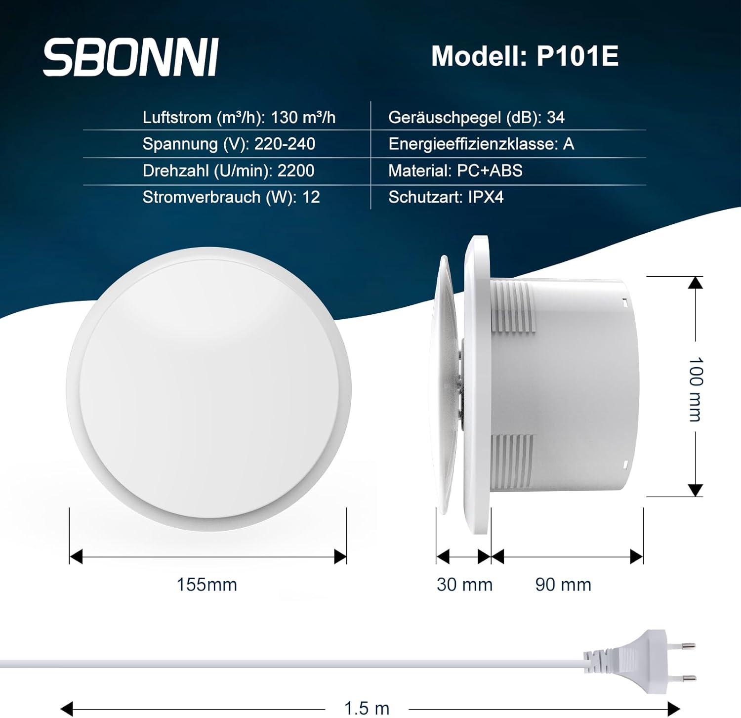 Hochleistungs-Engineering-Material PC+ABS: Der wc lüfter ist aus PC+ABS Material gefertigt, das umfangreichen Hitzetests unterzogen wurde, um langfristige Haltbarkeit zu gewährleisten. Es ist beständig gegen Verformung und Korrosion, und bietet in den kommenden Jahren eine zuverlässige Lösung für Feuchtigkeit, Gerüche und Schimmelprobleme im Raum.