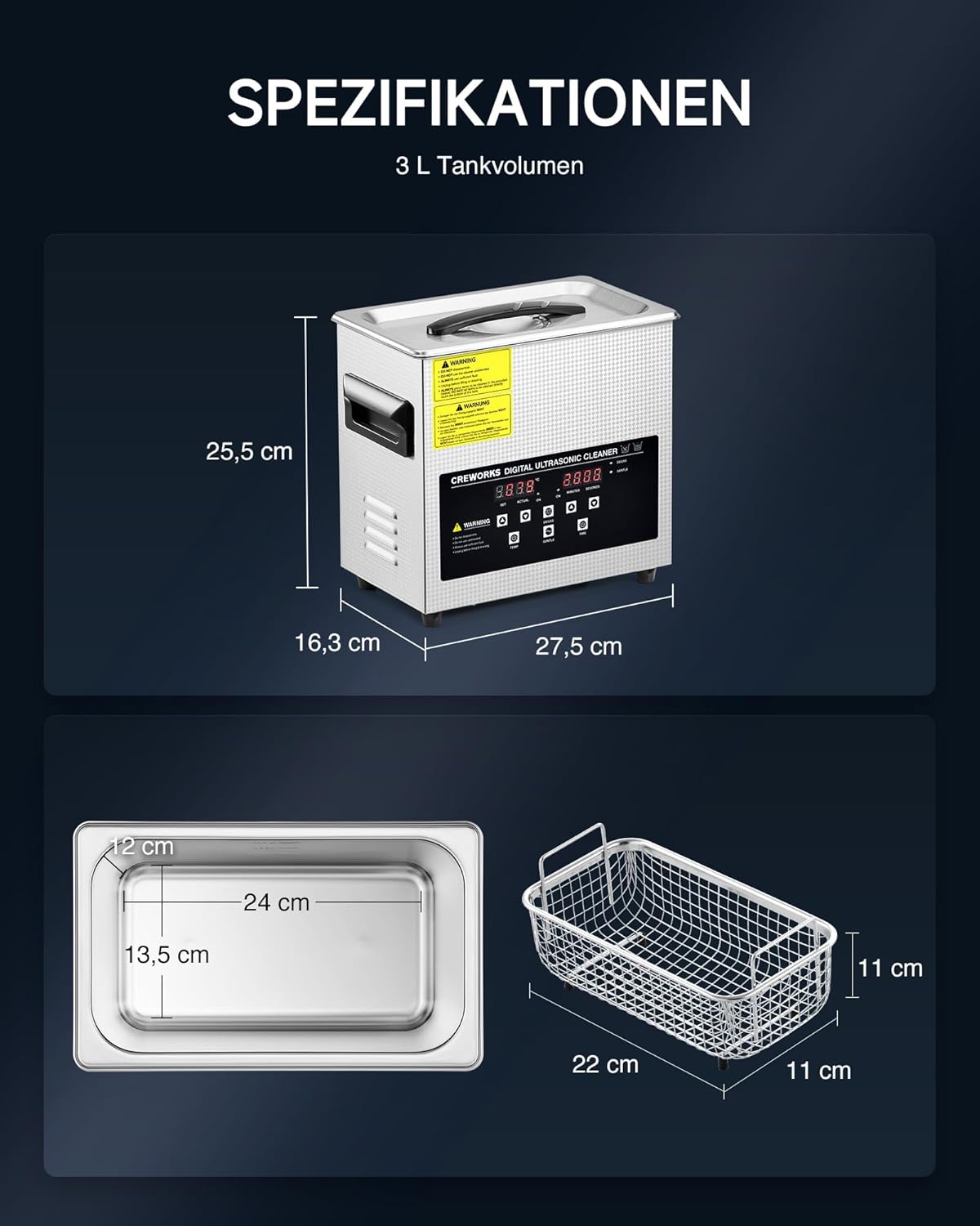 CREWORKS Ultraschallreinigungsgerät 3L mit Degas- und Sanftmodus Ultraschallreiniger mit Innenkorb
