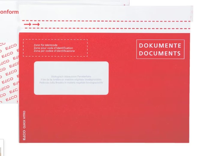 Dokumenten- und Lieferscheintaschen »Quick Vitro« C5 250 Stück, Dokumententasche aus Papier mit Fenster rechts, mit Perforation, Versand: Versand von Lieferscheinen oder Dokumente auf Paketen / Päckchen / Versandtaschen, Format: C5 (229 x 200 mm), Bedruckt: Dokumente / Documents, Qualität: Kraftpapier mit 110 g/m² / Fensterfolie, Verschluss: Haftklebeverschluss, Farbe: rot, Nachhaltigkeit: biologisch abbaubar, / FSC zertifiziert, Inhalt: 250 Stück, Swissmade
