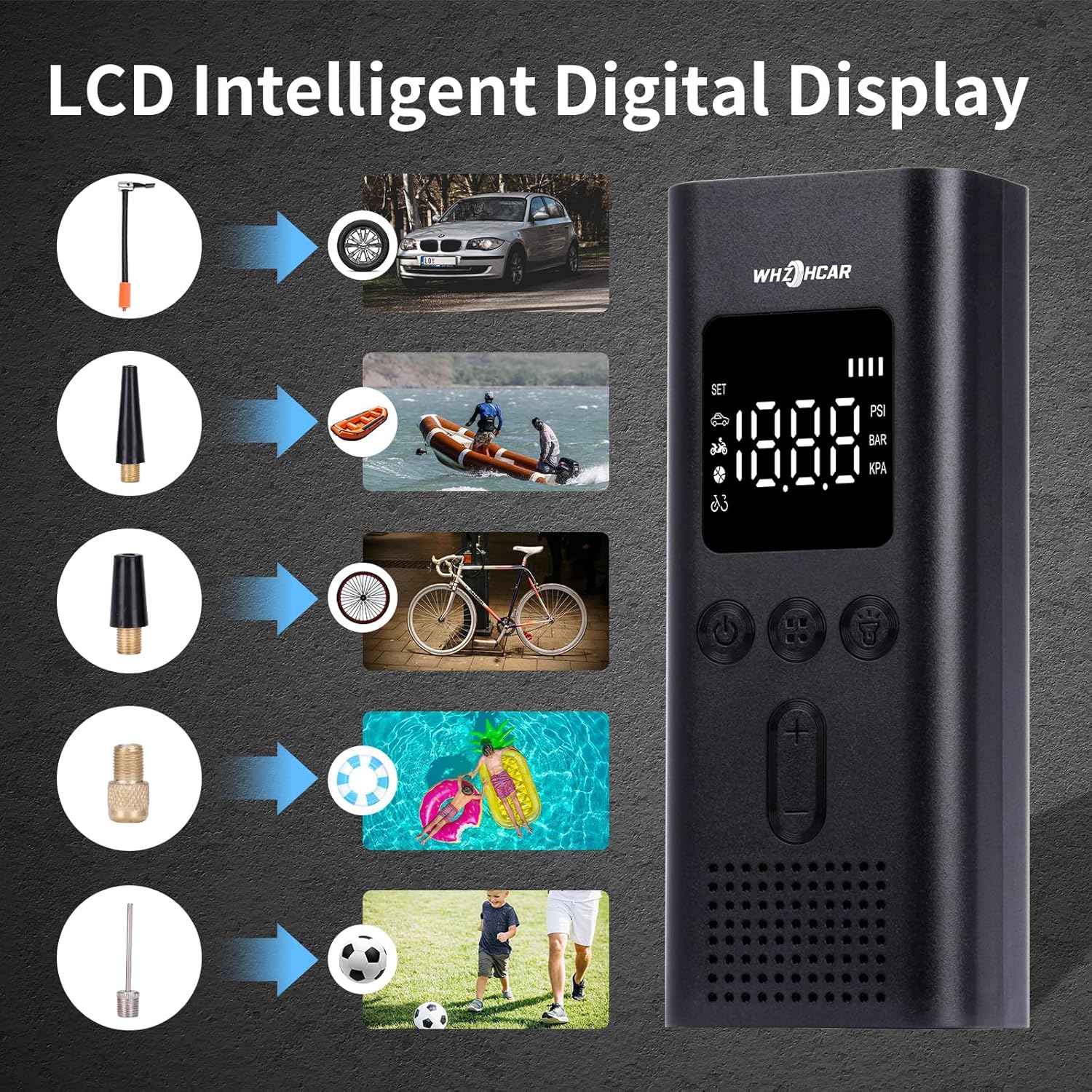 Akku mit großer Kapazität :WHZOHCAR Fahrradpumpe elektrisch mit einem großen 6000mAh Akku.Einfaches Aufladen über die praktische Typ-C Schnittstelle.So können Sie Autoreifen, Motorradreifen, Bälle und aufblasbare Spielzeuge in wenigen Minuten aufpumpen. Sie pumpt effizient und schnell auf und spart Ihnen Zeit und Mühe