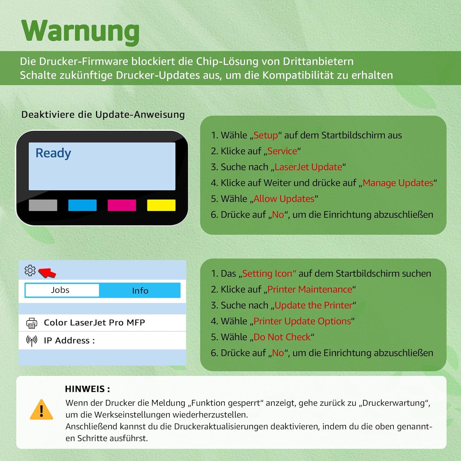 Warmer Hinweis: Da die Aktualisierung der Drucker-Firmware die Kompatibilität der Tonerkartusche beeinträchtigen kann, wird empfohlen, die automatische Aktualisierungsfunktion der Drucker-Firmware anhand der Anleitung auf unserer Detailseite zu deaktivieren, um einen reibungslosen Betrieb der Tonerkartusche zu gewährleisten. Dieser Vorgang hat keinen Einfluss auf die normale Nutzung des Druckers.