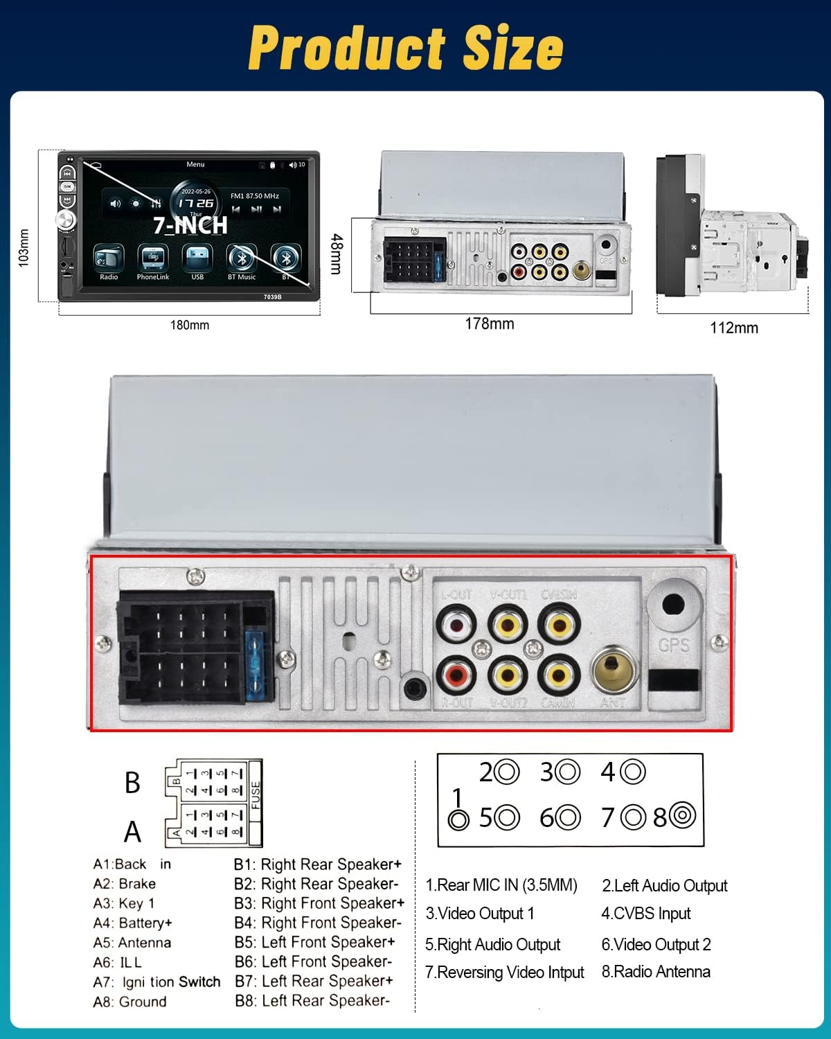 1-Din-Autoradio: 7-Zoll-1-Din-Touchscreen, passend für Single-Din-Dash-Optionen. Hauptbildgröße: 180 (L) x 130 (H) mm. Installationsgröße: 178 (B) x 50 (H). Mit TF-Karte, USB, AUX-Eingang, RCA-Audioausgang (L-Ausgang, R-Ausgang) Por