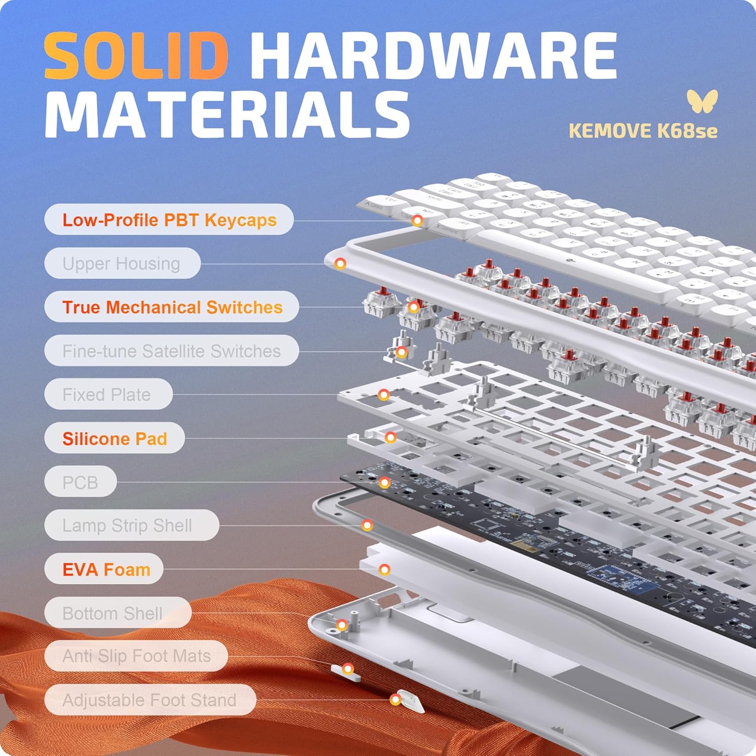 【PBT-Niedrige Tastenkappen】Die taktilen Kappen des K68 bestehen aus PBT-Material, das robust, stabil und nicht haltbar ist und eine angenehme Lebensdauer hat. Die flachen DSA-Tastenkappen und die U-förmige Tastenkappen-Schnittstelle bieten ein feines Finish unter den Fingern und sorgen für ein zusätzliches Tippgefühl.