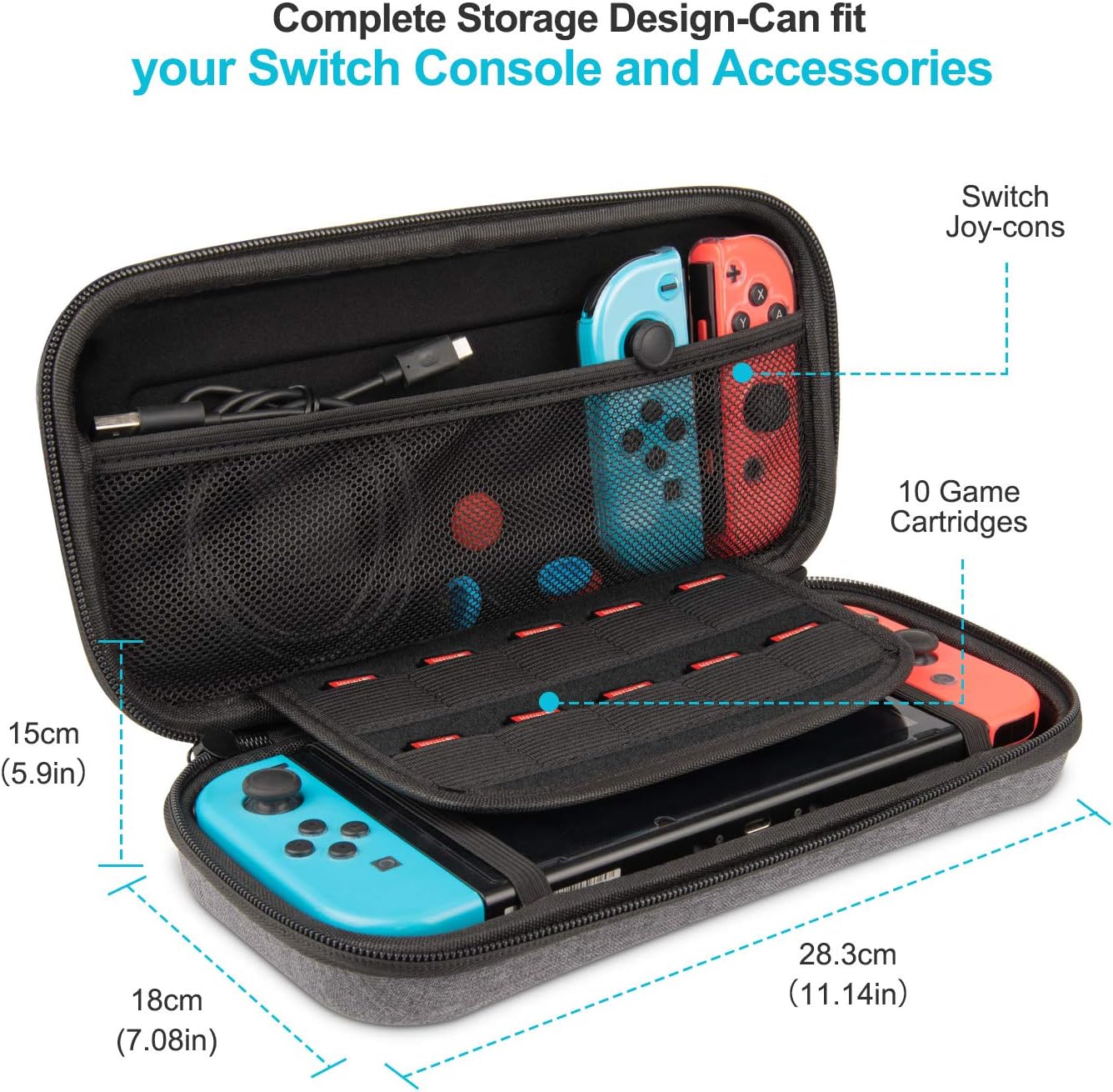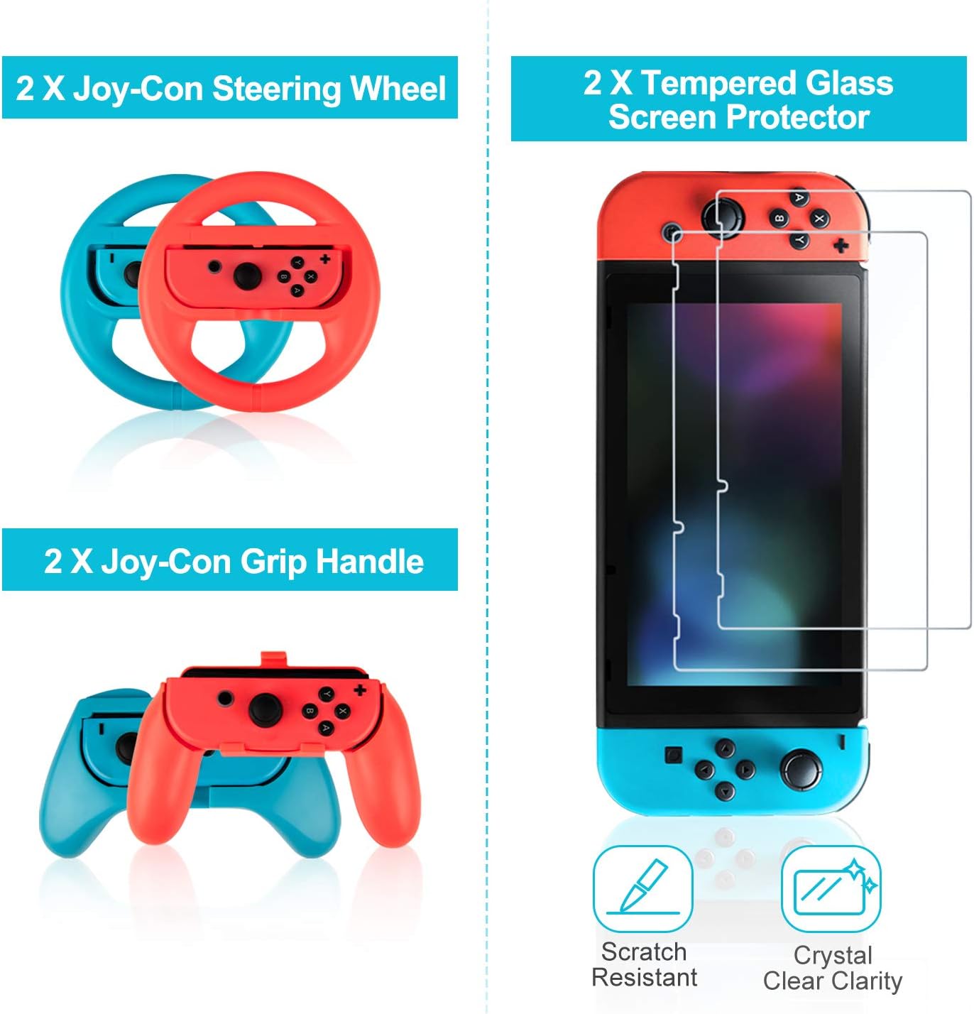 19-in-1-Bundle-Zubehörset: Switch-Ständer + Verlängerungskabel + Spielkartenhülle + Tragetasche + Schutzglas + Kristallhülle + J-Con TPU Hülle + J-Con Daumengriffkappen + J-Con Griffgriff + J-Con Lenkrad + J-Con Ladestation mit 1 USB-Typ-C-Kabel