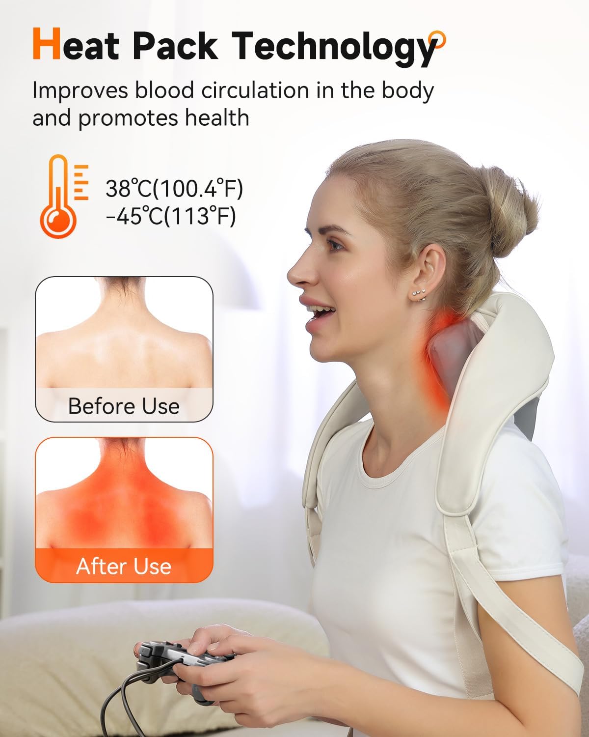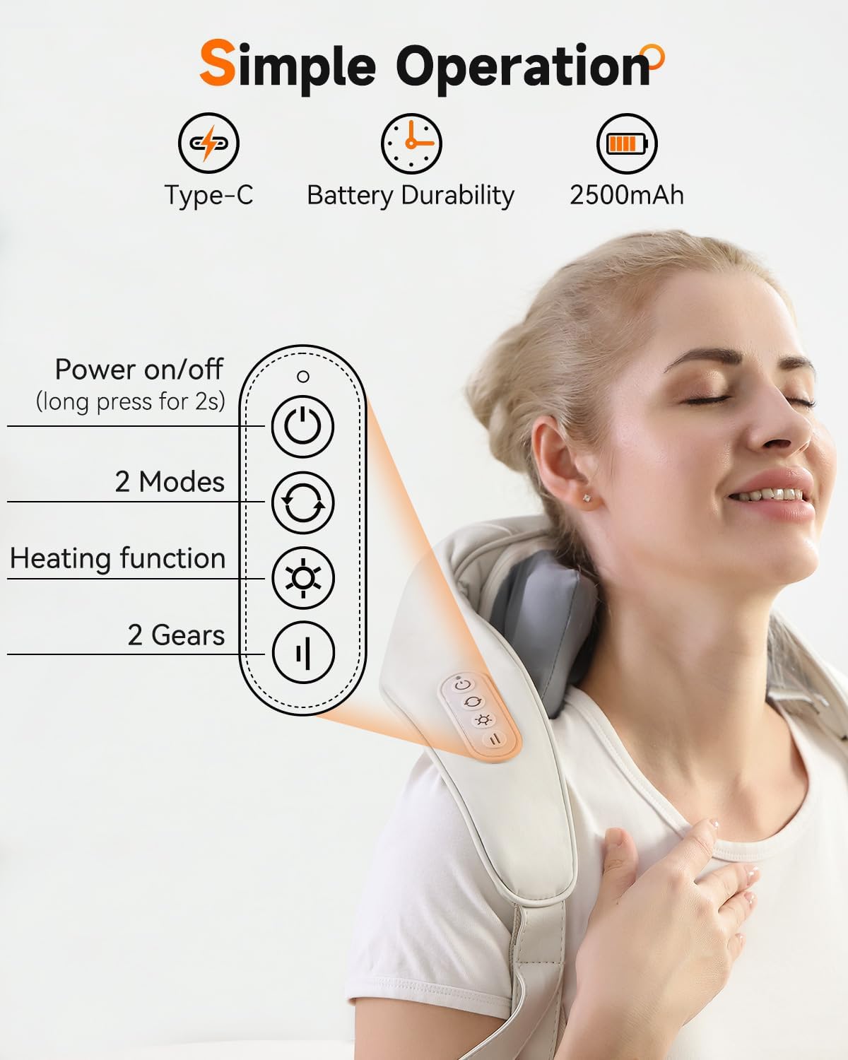 6D-Kneten, tiefenwirksames Nackenmassagegerät: Unser Nackenmassagegerät imitiert die Präzision und Sanftheit der Hände eines Masseurs mit einer einzigartigen Kombination aus Kneten und Greifen, die die Nacken- und Rückenmuskulatur stärkt und Nackenverspannungen lindert. Ideal für alle, die effektive Linderung von Alltagsstress und Muskelermüdung suchen. Wärmekompressionsfunktion: Das wärmeverstärkende Nackenmassagegerät verbessert Ihr Massageerlebnis mit seiner Wärmefunktion, verbessert effektiv die Durchblutung und entspannt verspannte Muskeln sofort – wie bei einer wohltuenden Spa-Behandlung zu Hause.