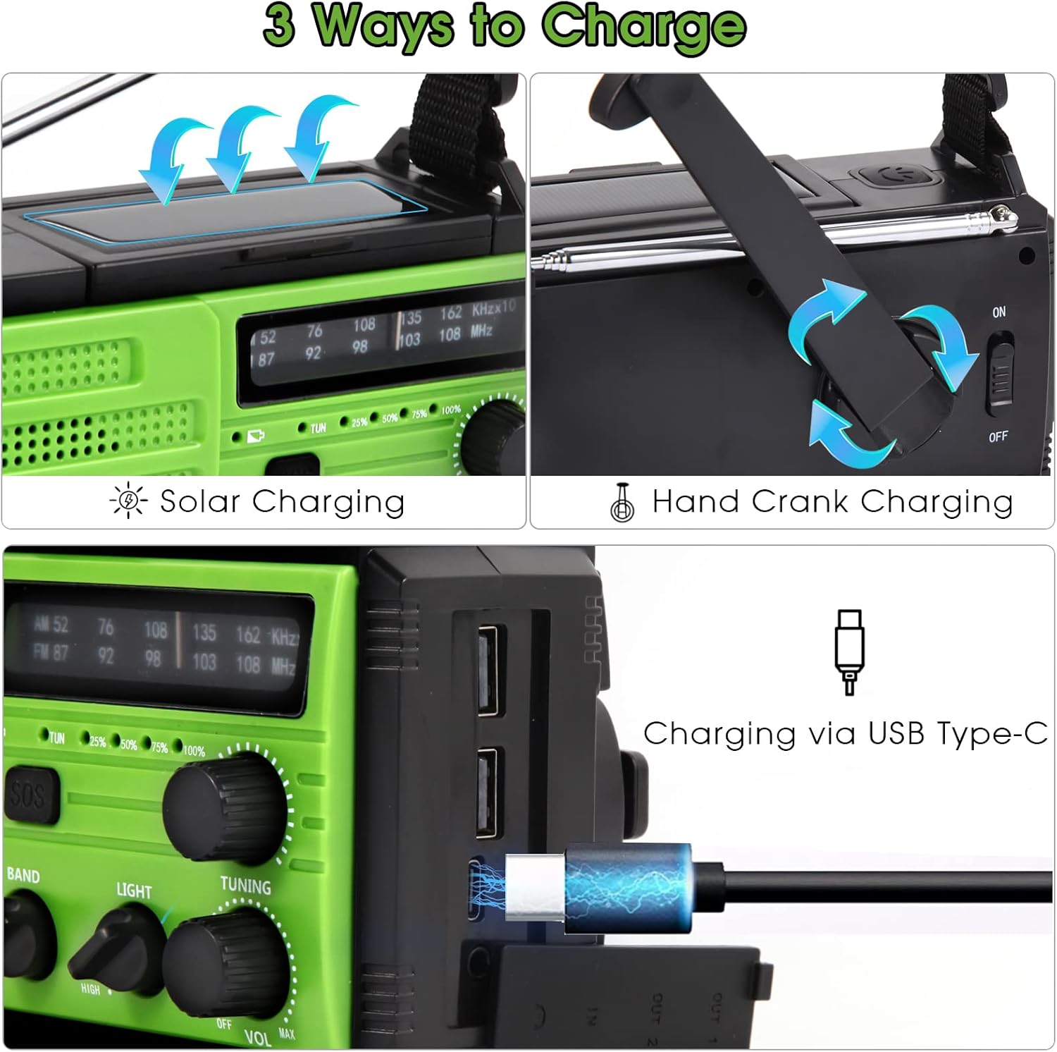 ????【WIEDERAUFLADBARER 8000-MAH-AKKU】: Eingebauter austauschbarer 8000-mAh-Lithium-Ionen-Akku, die Akkukapazität ist doppelt oder sogar viermal so hoch wie bei anderen Höhensonne-Radios auf dem Markt und kann ununterbrochen bis zu 72 Stunden verwendet werden (50% Lautstärke ). Und mit zwei USB-Ausgangsports kann es zwei Mobiltelefone oder elektronische Geräte gleichzeitig aufladen, um sicherzustellen, dass die Geräte im Notfall aufgeladen bleiben.