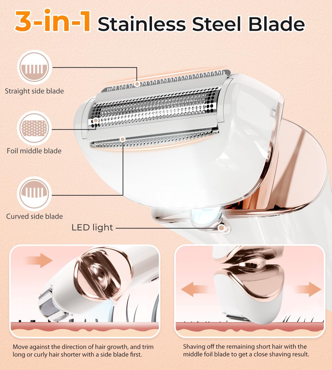 ❤️【3 verschiedene Arten von Klingen in einer Klinge】 Wiederaufladbare Damenrasierer für die Rasur enthalten eine gerade Seitenklinge, eine schwimmende Folie und eine gebogene Seitenklinge, um verschiedene Haarlängen zu rasieren. Lady schnurloser Rasierer nimmt 3 Arten von scharfen Klingen und einen Hochgeschwindigkeitsmotor an, es hilft sicher und einfach an Ihrem Bein, Arm usw. in wenigen Minuten zu rasieren.