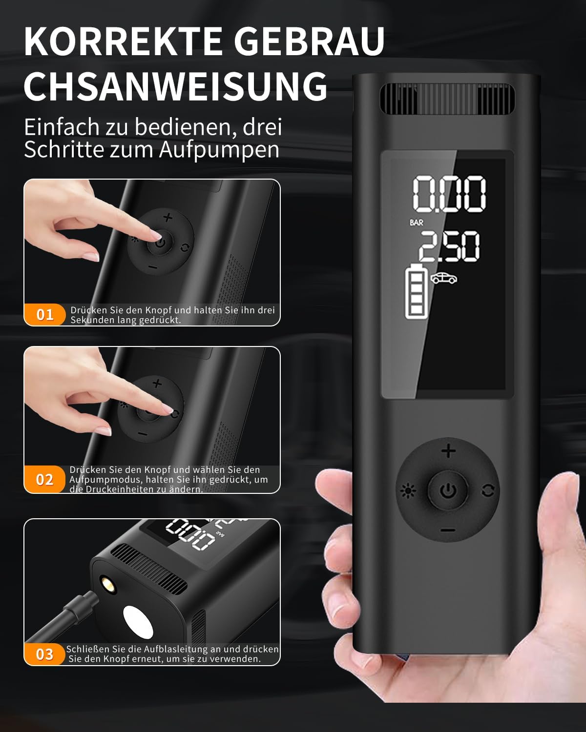 ????【LED-Doppelanzeige】Großes LED-Display zeigt Druck- und Verarbeitungsanforderungen in Echtzeit an, um den Reifendruckstatus zu überprüfen. Tragbare Luftpumpe Klicken Sie auf die Umschalttaste, um zwischen Benutzerdefiniert → Auto → Motorrad → Fahrrad → Ball zu wechseln. Drücken Sie lange auf die Umschalttaste, um vier Arten zu wählen: PSI → BAR → KPA → kg/cm2. Der Mini-Luftkompressor ist die beste Wahl für das Aufpumpen von Autos, Motorrädern und Fahrrädern