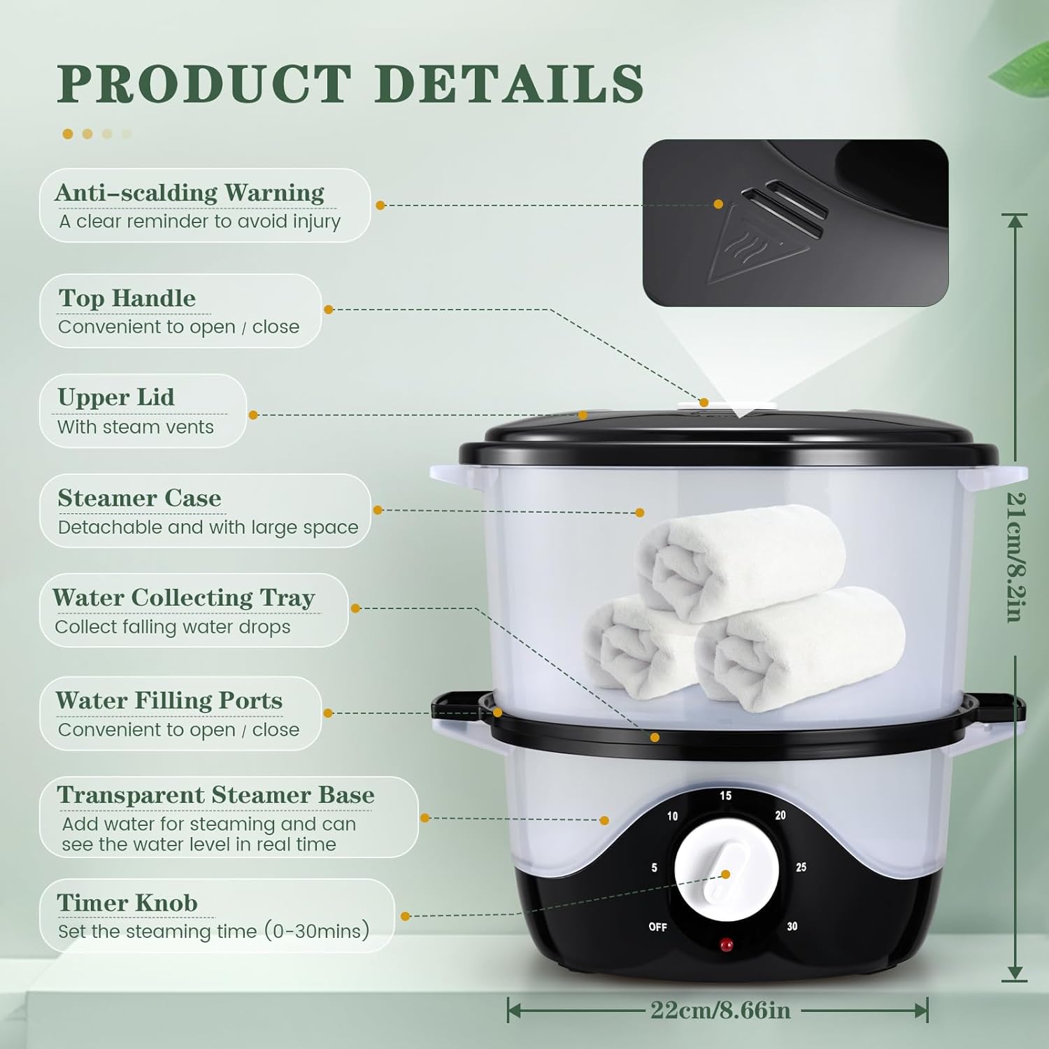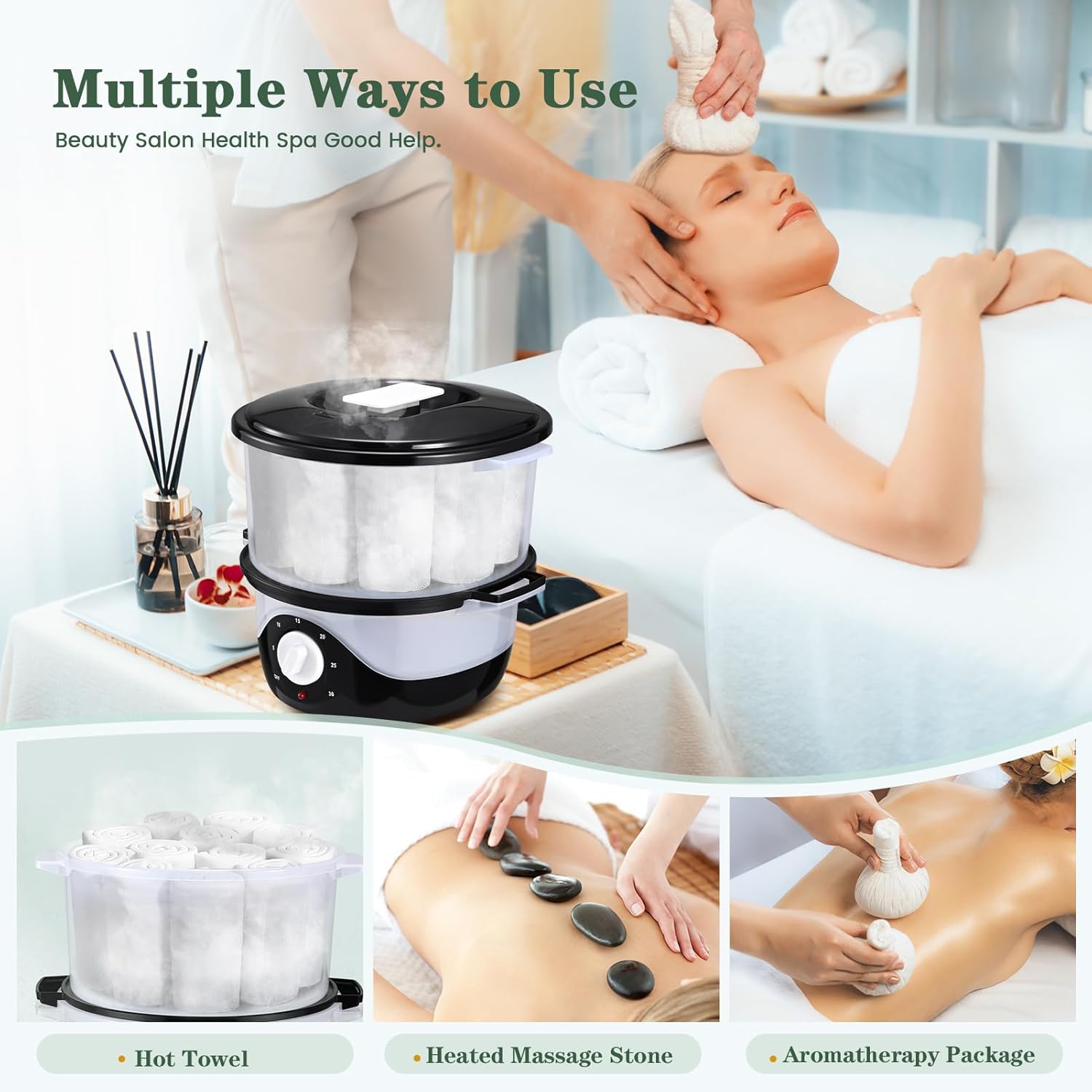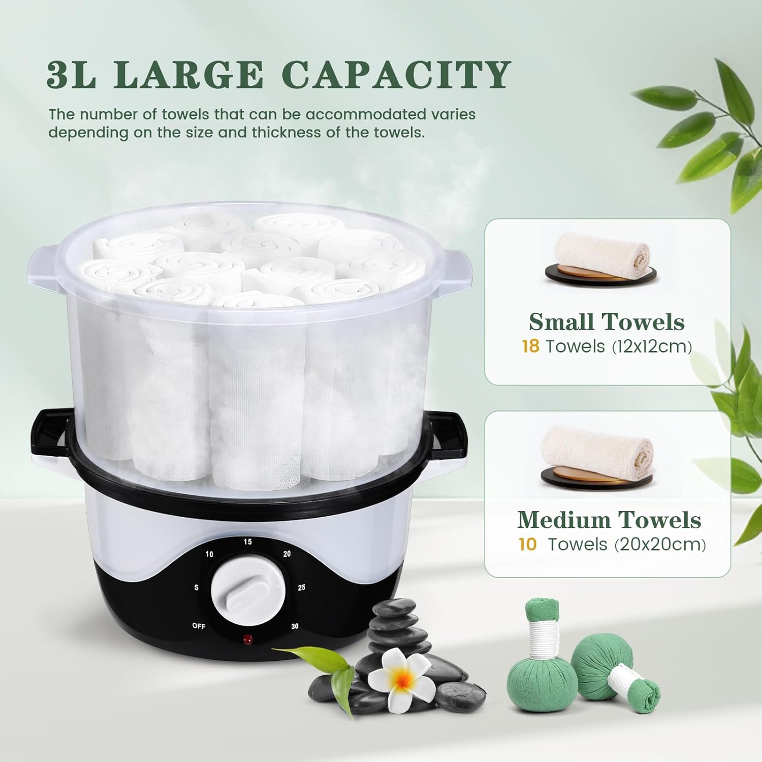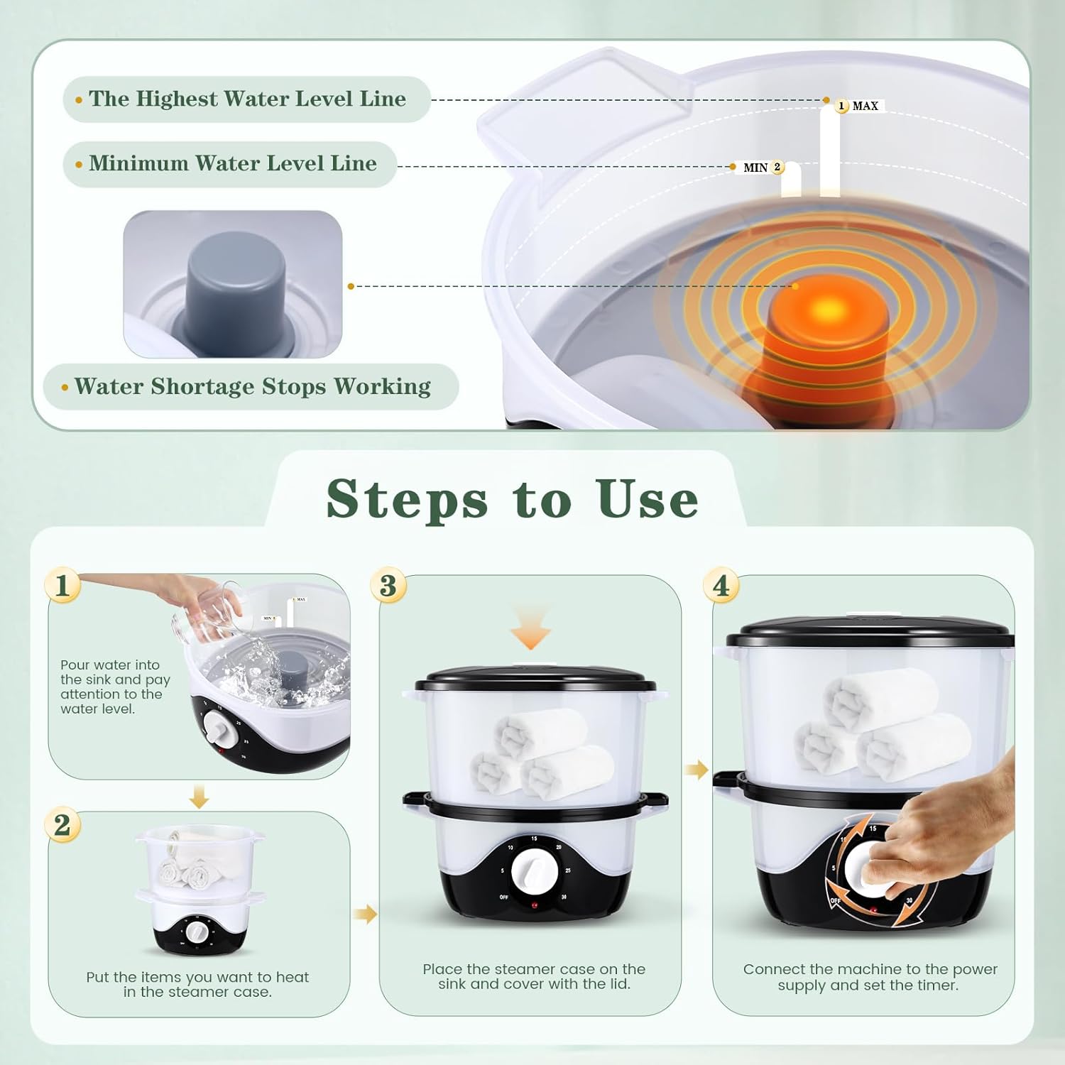 【Vielseitig einsetzbar und einfach zu verwenden】: Dieser Handtuchdampfer kann nicht nur für Gesichtsbehandlungen, sondern auch für Heißkompressen, Muskelentspannung, Schmerzlinderung und Augendrucklinderung verwendet werden. Und auch als Tod-Stöße-Dampfgerät, Badetuch wärmer, Nacken wärmer oder für Wärmepackungen. Befeuchten Sie die Handtücher vor, rollen Sie sie dann auf, bevor Sie sie in Handtuchwärmer, stellen Sie den Knopf ein, stellen Sie die Heizzeit.