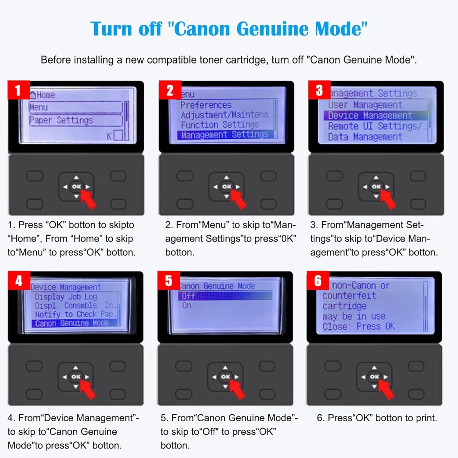 1. Achtung: Wenn sich in Ihrem Drucker der "Canon-Originalmodus" befindet, müssen Sie diesen Modus schließen, schließen Sie den Canon-Original-Modus wie folgt: Menü > Verwaltungseinstellungen > Geräteverwaltung > Canon Original-Modus > Aus. Nachdem Sie den Canon Original-Modus geschlossen haben, wird der kompatible Toner installiert, es wird die Aufforderung "Keine Canon-Patrone ist möglicherweise eingelegt" auf dem Drucker angezeigt, drücken Sie einfach die Taste "OK" für Einzelfunktionsdrucker oder klicken Sie auf "Schließen". Auf dem Bildschirm für Multifunktion Drucker sollte der Toner funktionieren.