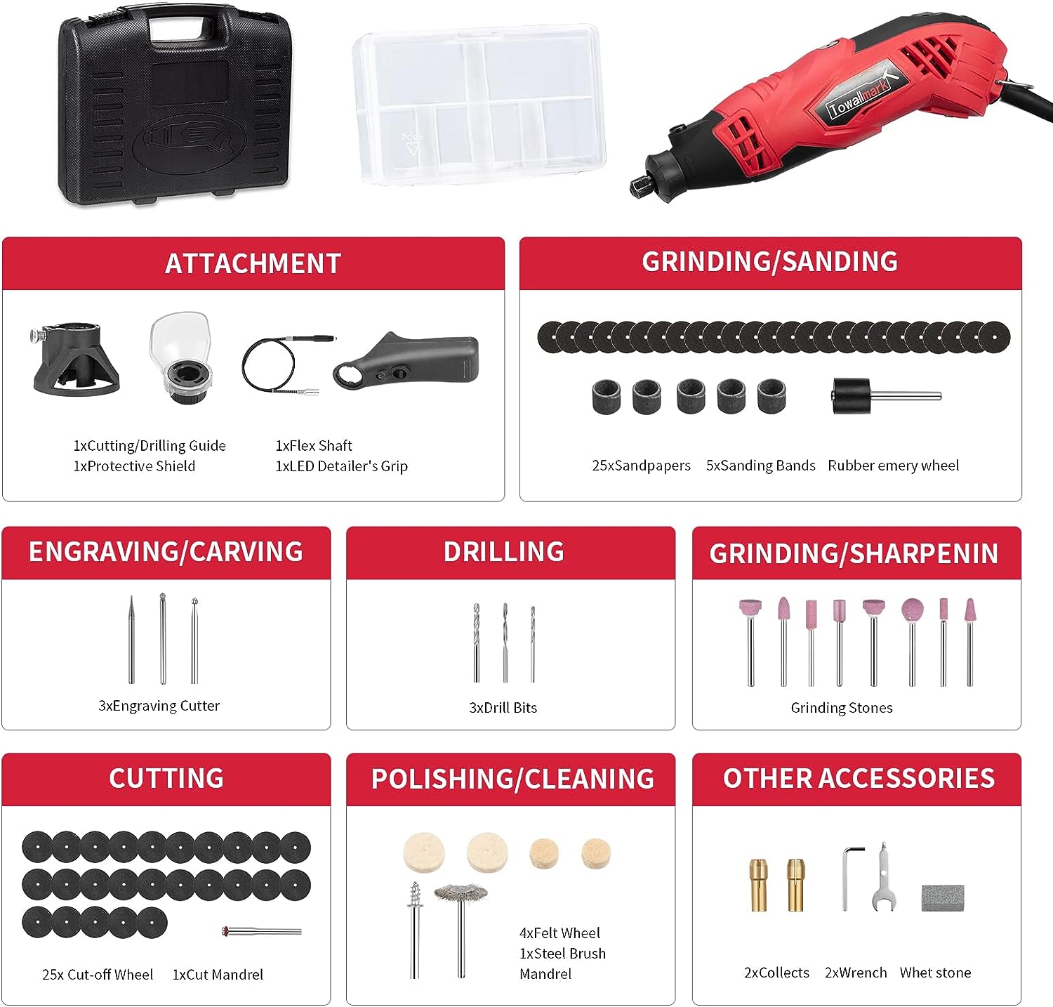 【Mehrzweck-Zubehör】: 88-teiliges Zubehör und 4 Aufsätze können Ihre unterschiedlichen Bedürfnisse und Anwendungen erfüllen, vom Schneiden, Holzschnitzen, Gravieren, Bohren, Schleifen, Polieren, Graften, Formen und Schleifen sogar von Haustiernägeln. Und es gibt noch viel zu tun und Projekte umzusetzen, auf denen wir aufbauen möchten.