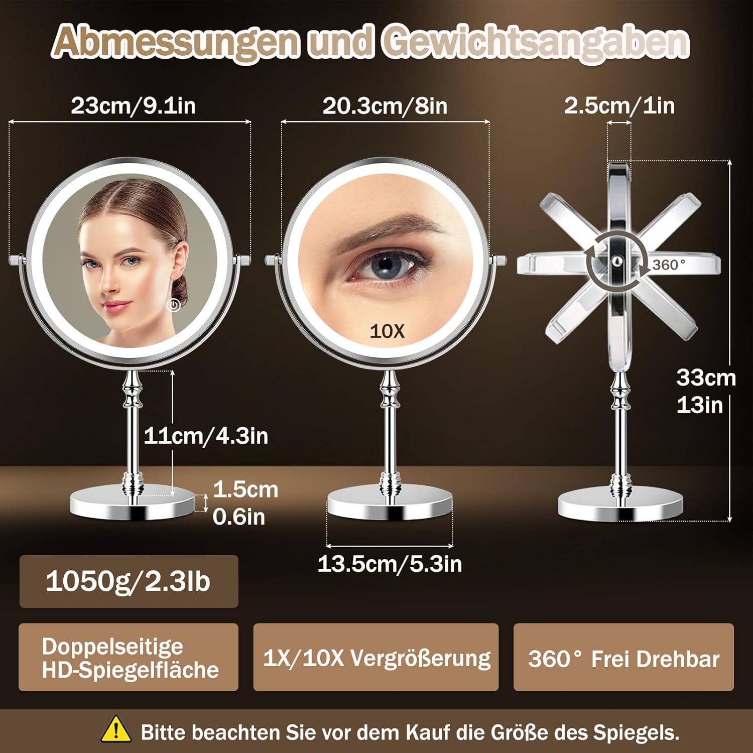⭐ 8 Zoll Großspiegel und 1X/10X Vergrößerung: 8 Zoll Kosmetikspiegel mit Beleuchtung, Weitwinkelansicht, perfekte Größe und Proportionen, luxuriöser und eleganter. Der Kosmetikspiegel hat eine Doppelseite, eine Seite ist ein Standardspiegel und die andere Seite ist ein 10-facher Vergrößerungsspiegel, mit dem Sie Ihre Gesichtszüge klar erkennen und Ihre unterschiedlichen Make-up-Anforderungen erfüllen können.