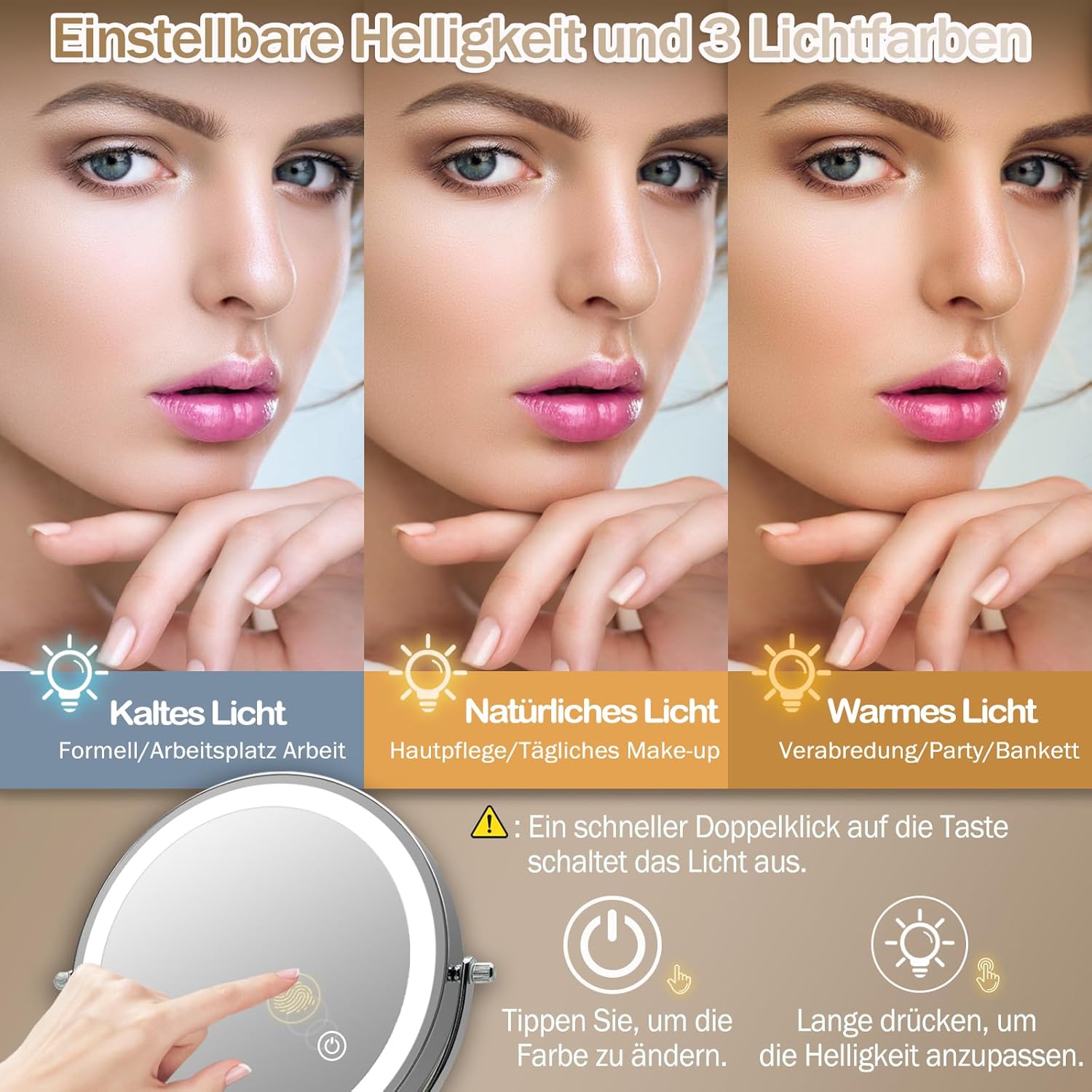 ⭐ 3 Farbtemperatur und Helligkeitseinstellung: Sie können den Beleuchtungsmodus und die Helligkeit des Kosmetikspiegels an die Umgebungsbedingungen und Make-up-Anforderungen anpassen. Drücken Sie kurz auf den Sensorschalter, um zwischen natürlichem Licht, weißem Licht und warmem Licht zu wählen, und drücken Sie lange auf den Schalter Stellen Sie die Helligkeit des Lichts des 10-fachen Vergrößerungsspiegels ein.
