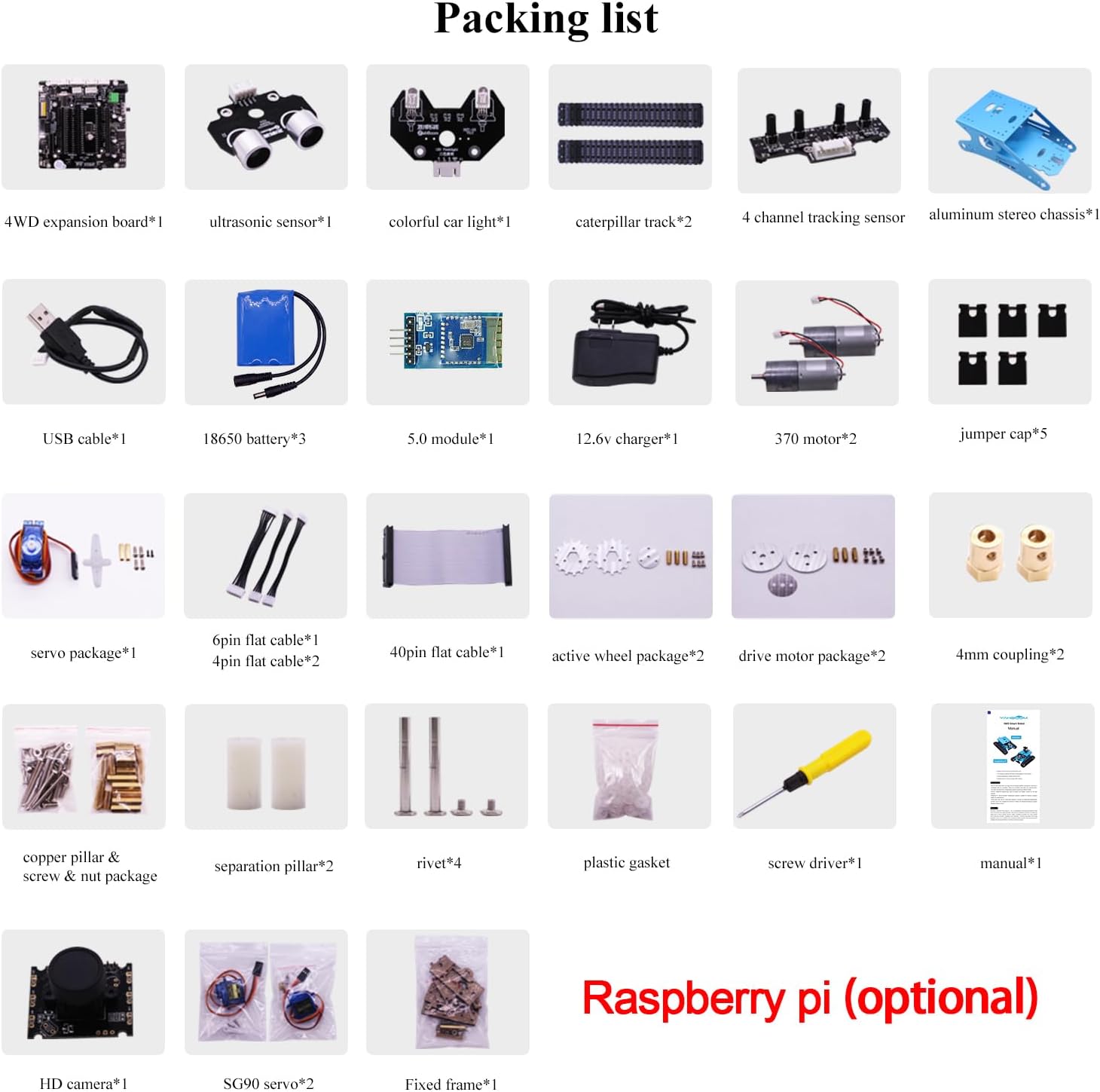 【Top-Roboterplattform】 Dieses Panzer-Kit besteht aus einem robusten Chassis aus Aluminiumlegierung, zwei leistungsstarken 370-Motoren, Metallkupplungen, hochwertigen Ketten, einer multifunktionalen Erweiterungskarte und verschiedenen Sensoren. Alle Zubehörteile sind langlebig. ★★★ Wichtig: Wenn Sie sich für den Kauf dieses Roboters entscheiden, legen Sie bitte das folgende Zubehör bereit. Andernfalls kann der Roboter nicht normal betrieben werden: Raspberry Pi 4B oder 3B + * 1, Kühlkörper, TF-Karte * 1. (Abhängig von der bestellten Version)
