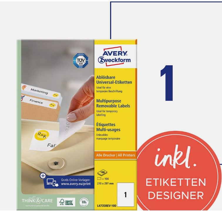 100 étiquettes AVERY Zweckform L4735REV 100 210,0 x 297,0 mm blanches 100 étiquettes AVERY Zweckform L4735REV-100 blanches 210,0 x 297,0...