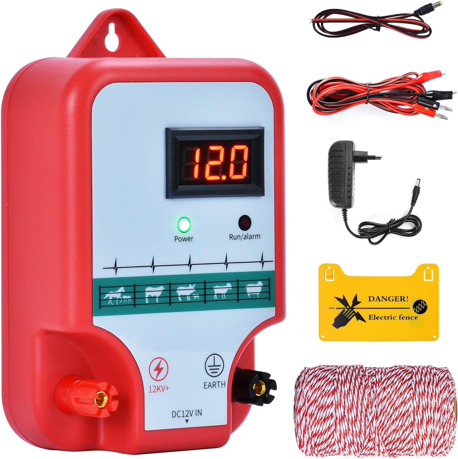 15 km Weidezaungerät mit Weidezaunlitze, 2J Weidegerät mit LED Display, Elektro Weide Zaun für Hühner, Schafe, Schweine, Füchse, Kühe, für...