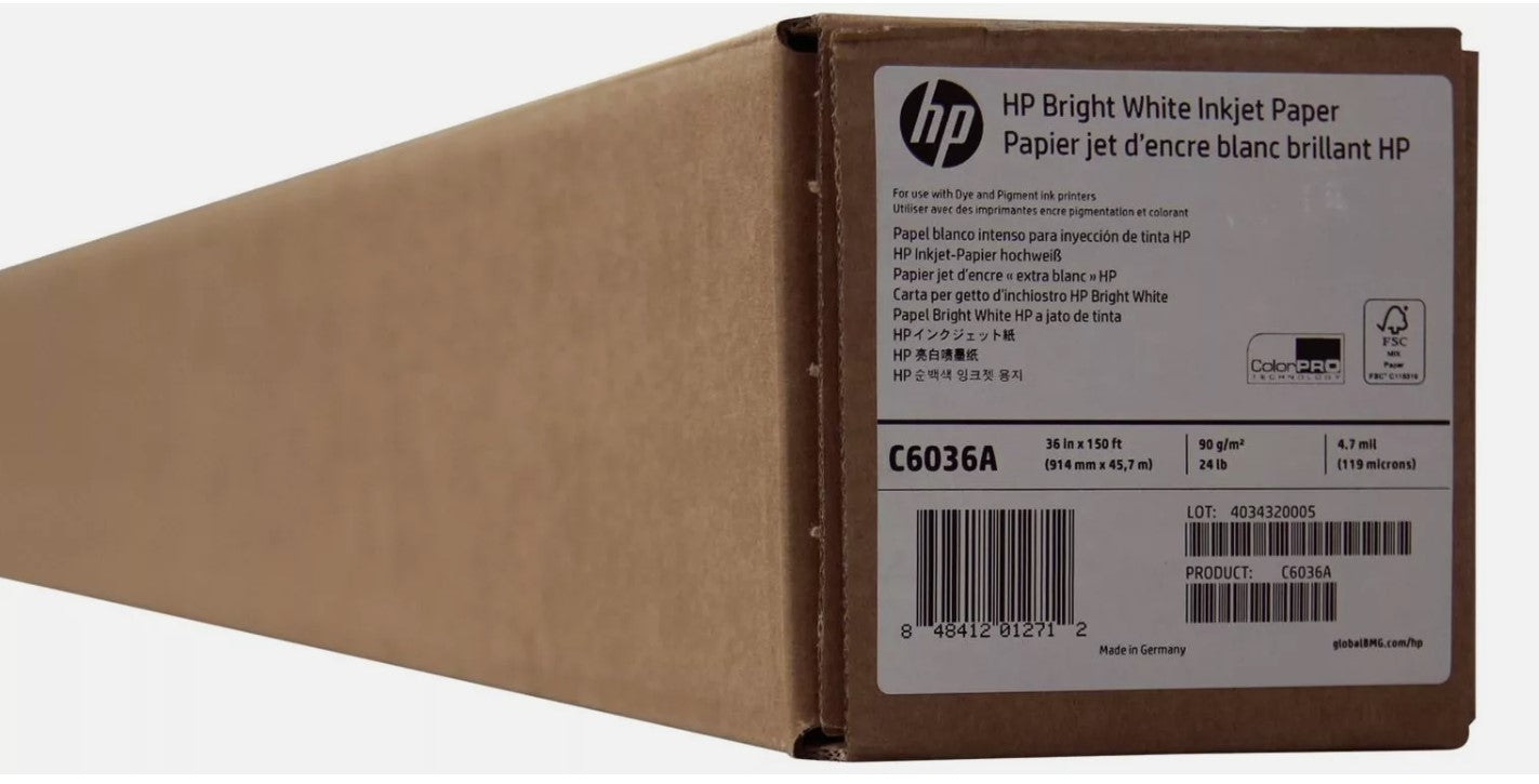 Rouleau de papier traceur »C6036A« 914 mm (36 pouces) blanc, papier couché, idéal pour des impressions durables, Type de papier : papier bond et imprimé, Qualité du blanc : 166 qualités CIE, Grammage : 90 g/m², Largeur du rouleau : 914 mm (36 pouces), Longueur du rouleau : 45,7 m, Contenu de la livraison : 1 rouleau de papier traceur