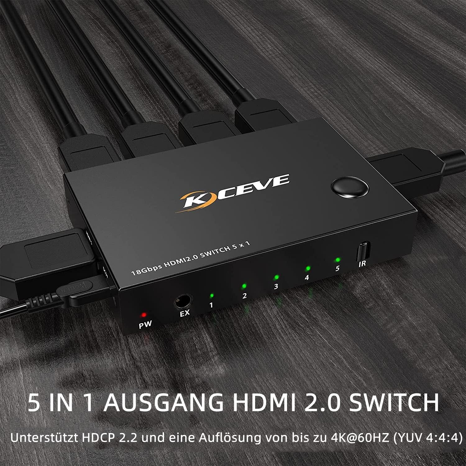 MLEEDA HDMI-Switch 4K 60Hz 5 in 1 Out, HDMI-Switch unterstützt 4K DR, HDCP2.2, 3D, 1080P, HDMI-Splitter für PS4/Xbox/HDTV/DVD mit Fernbedienung