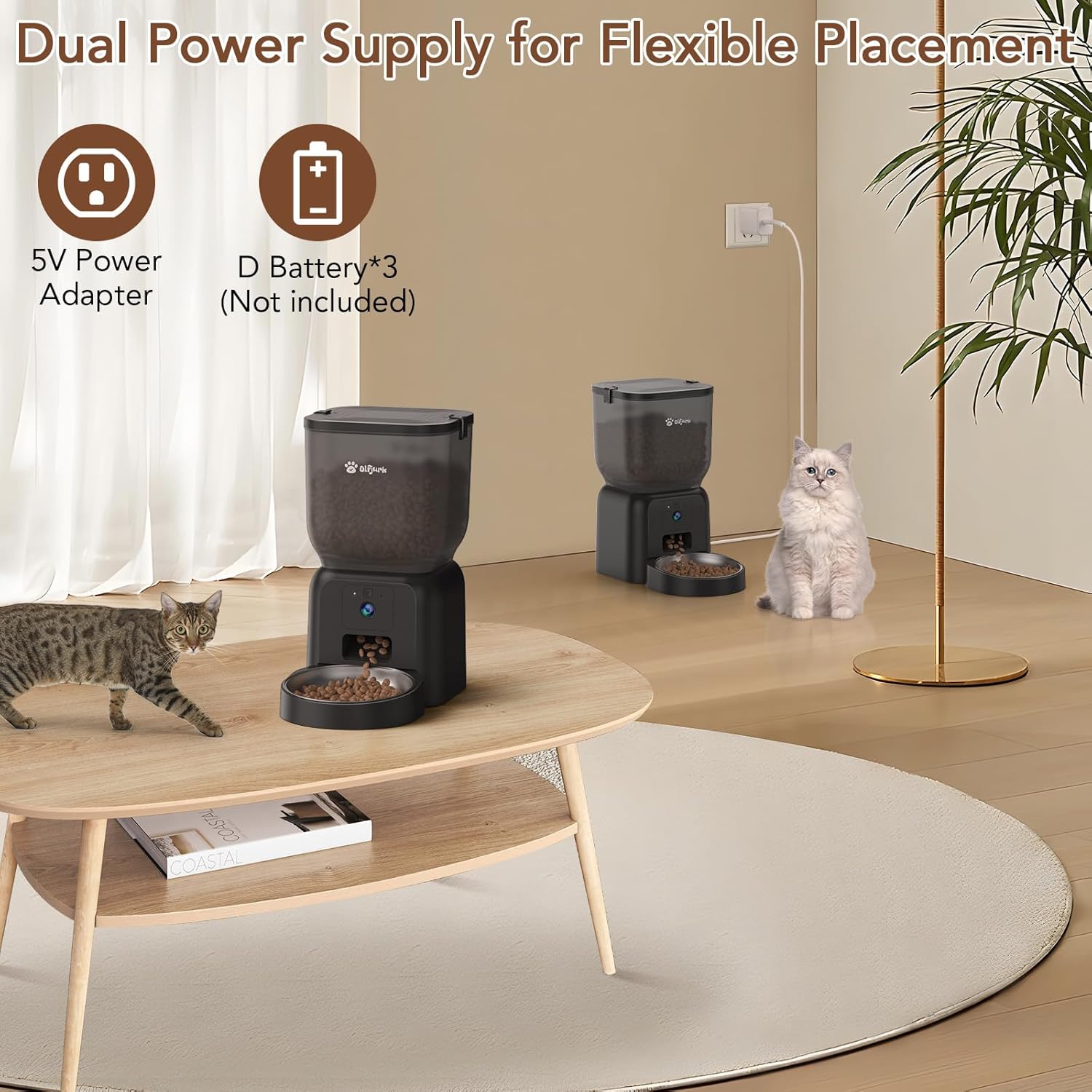 Dual-Power-Modus: Stromversorgung über ein 5-V-Netzteil oder 3 D-Batterien (nicht im Lieferumfang enthalten); stellt sicher, dass Ihre Haustiere auch bei einem Stromausfall gefüttert werden. Für einen unterbrechungsfreien Betrieb wird die Verwendung von Akku und Netzteil empfohlen.