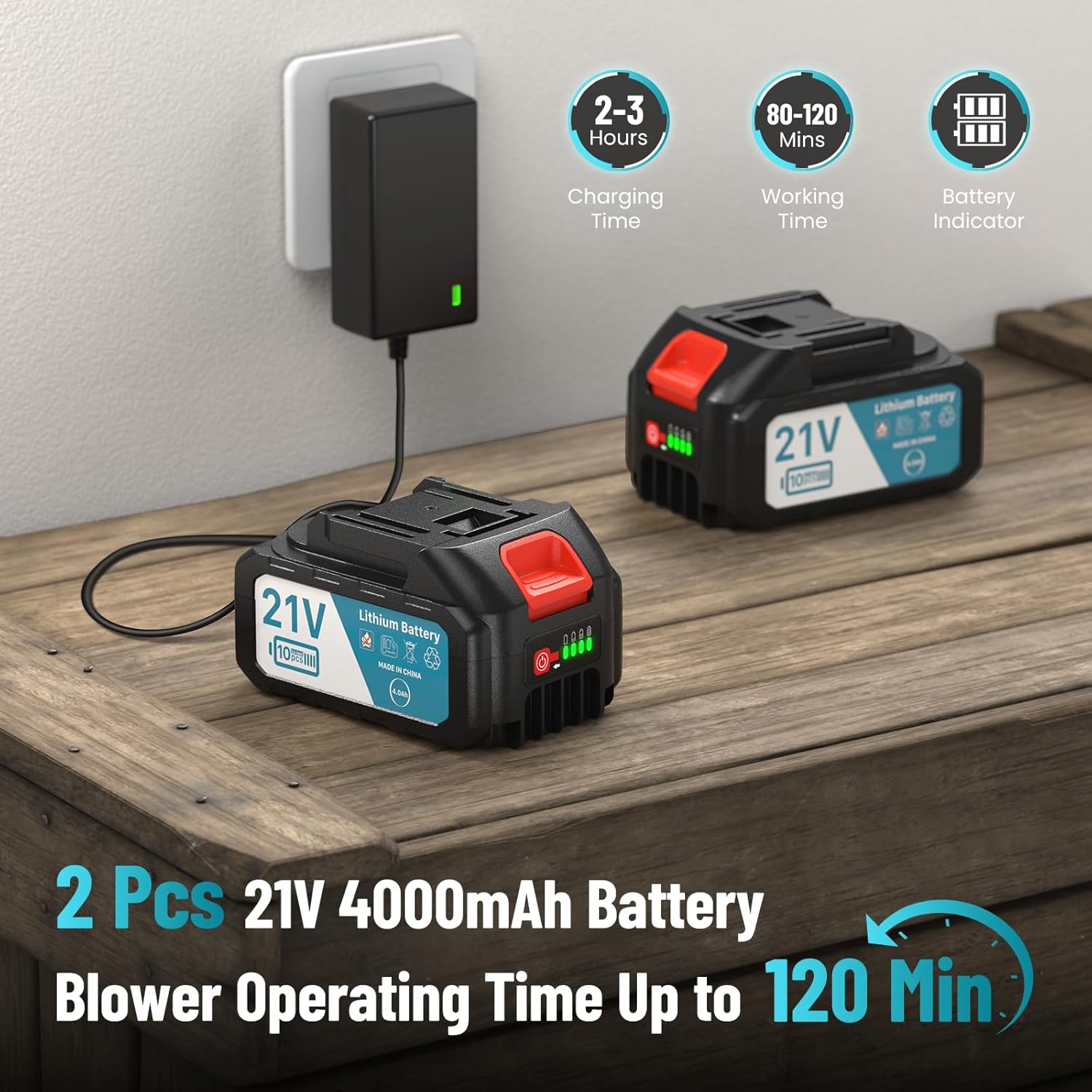 【AUSERGEWÖHNLICHE AKKULAUFZEIT】Nous supprimons l'Akkulaufzeit du Mini Kettensäge Ihr wichtigstes Anliegen ist. Notre chargeur de batterie est alimenté par une batterie 2x4000mAh 21V et un chargeur de batterie, qui dure 50 à 60 minutes. Wideraufladbare Akkus mit Overlastungs- und Temperaturschutz s'occupe de vos longues vacances. Il y a également un Akkustatusanzeige, avec pour résultat que la charge pourrait être terminée.