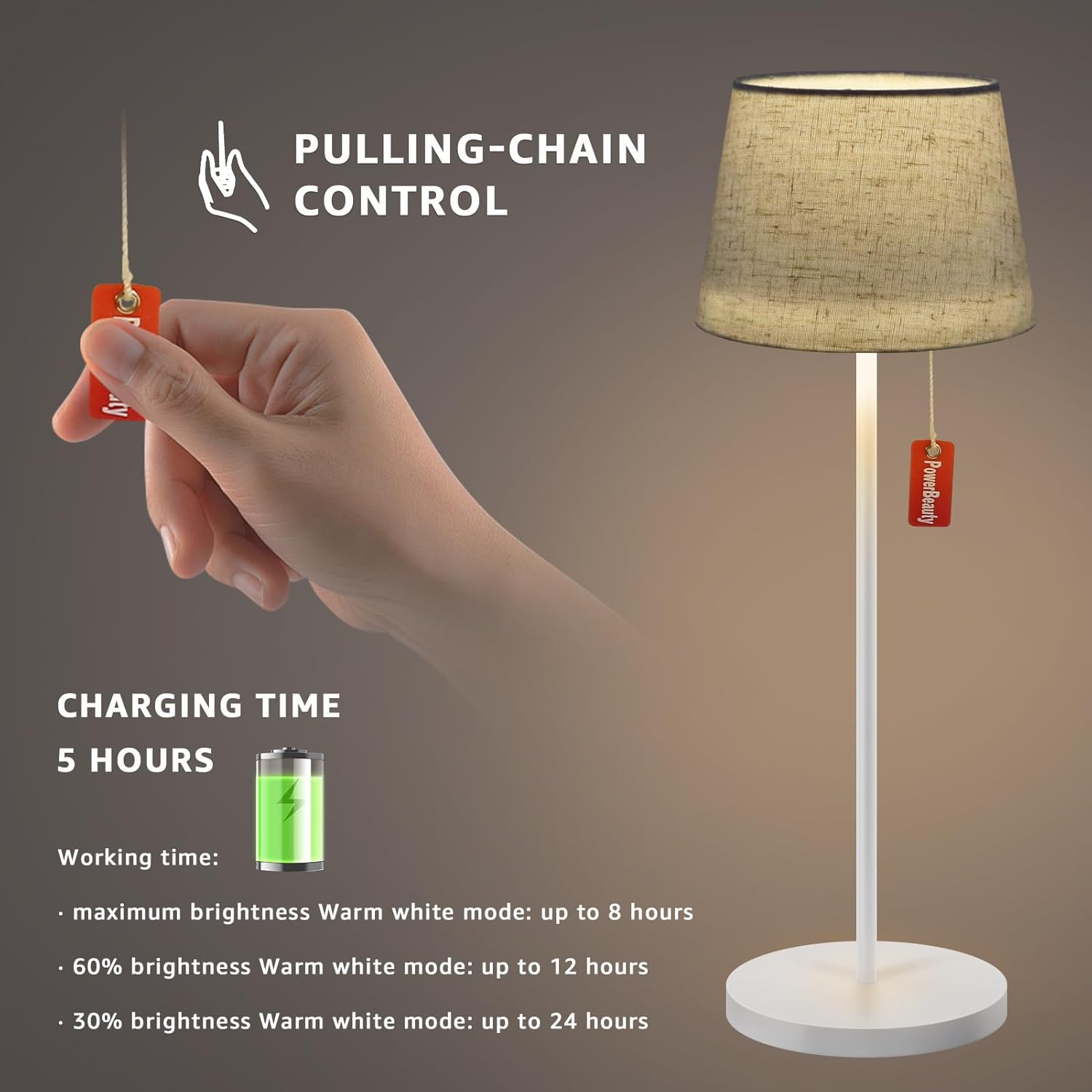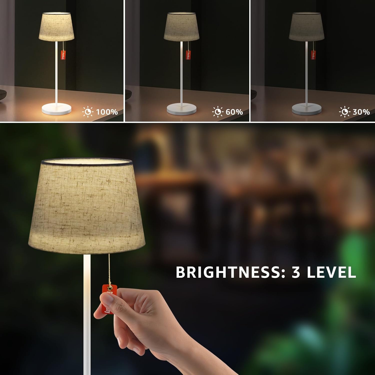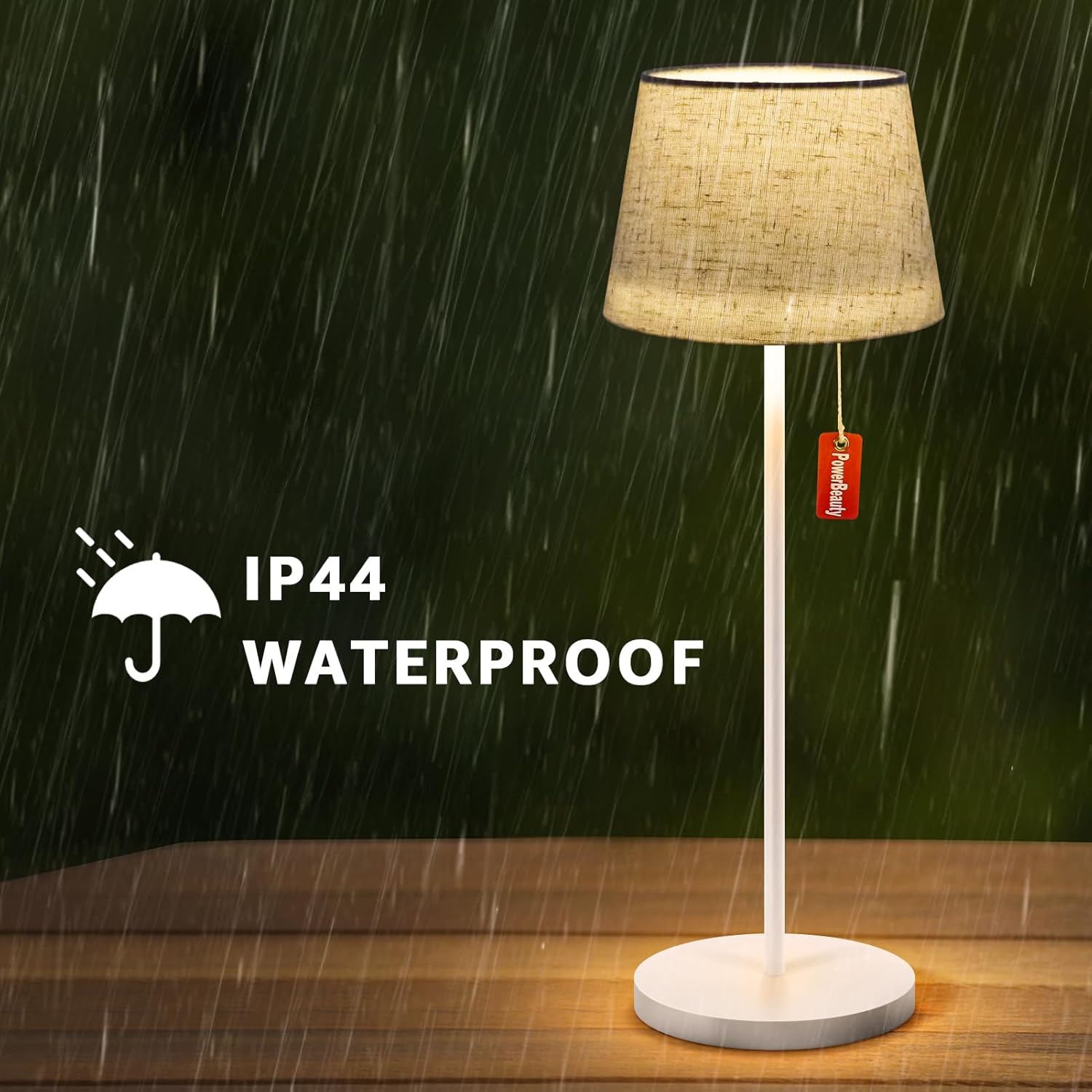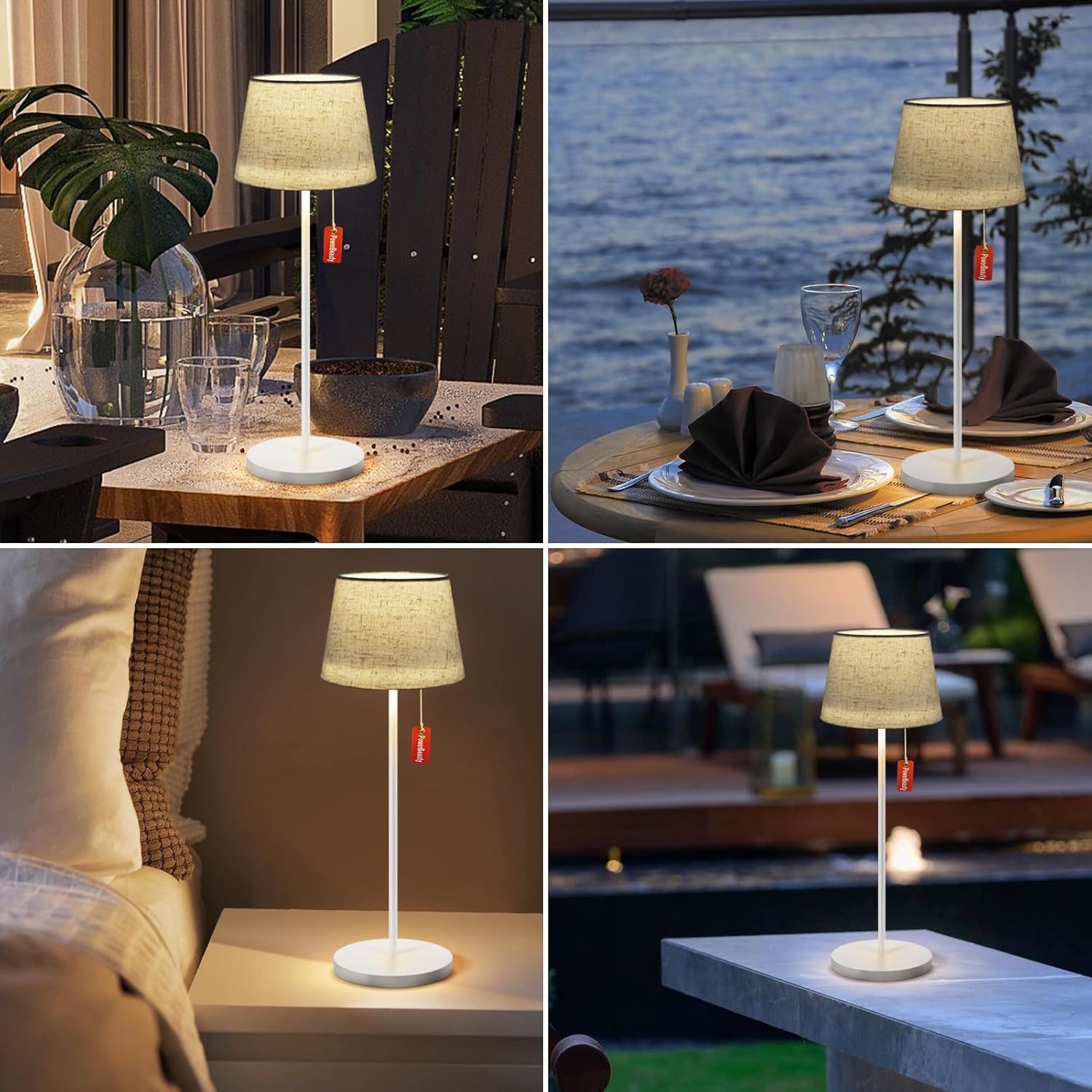 【Schirm aus Stoff + Sockel aus Metall】Unsere tischlampe outdoor ist mit einem Stoff-Lampenschirm und einer Metallbasis ausgestattet, um eine natürlichere und sanftere Lichtdurchlässigkeit zu gewährleisten. Die Verwendung von Metall für Ständer und Basis sorgt für Stabilität, was sicherstellt, dass unsere tischlampe kabellos in vielen Situationen stabil bleibt, sowohl innen als auch außen.