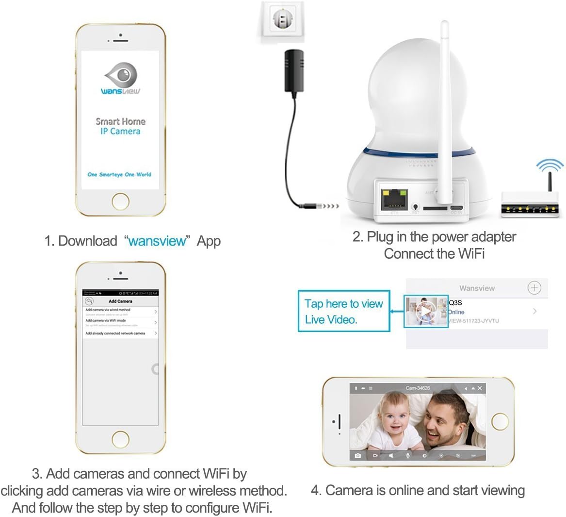 Nehmen Sie viele schöne Fotos und Videos auf: Die kabellose Kamera ermöglicht die gleichzeitige Betrachtung durch bis zu vier Personen über die Wansview-App auf iPhone/Android-Smartphone, PC und Tablet. Halten Sie besondere Momente fest und teilen Sie sie mit Freunden und Familie.