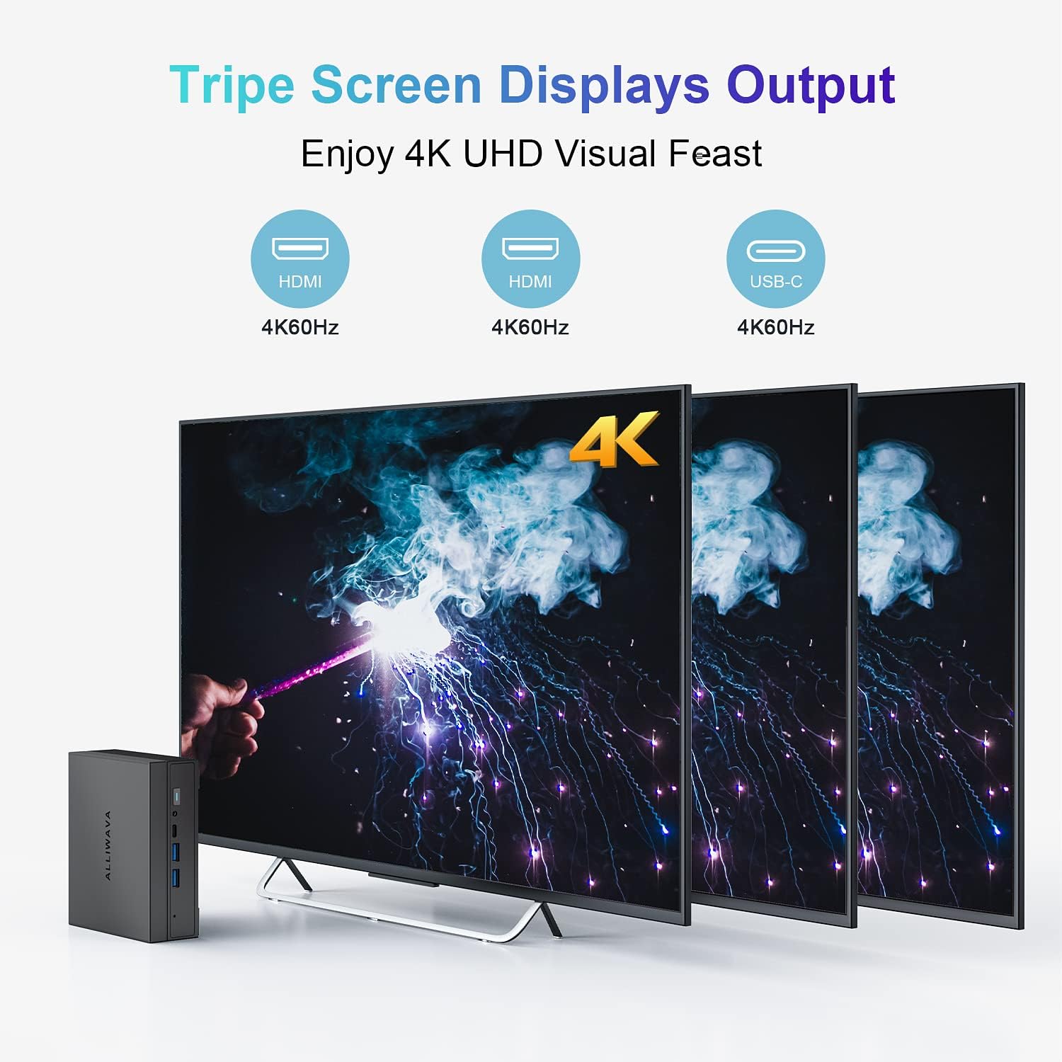 W11 Pro und Dual-Screen-Display: Installiertes Win11 Pro, kompatibel mit W10. Ideal für verschiedene Anwendungsszenarien wie Zuhause, Unterhaltung, Büro, Online-Bildung, Industrie usw. Dual HDMI und USB-C ermöglichen den gleichzeitigen Anschluss von drei Monitoren, was Ihre Arbeitseffizienz vereinfacht und verdoppelt.