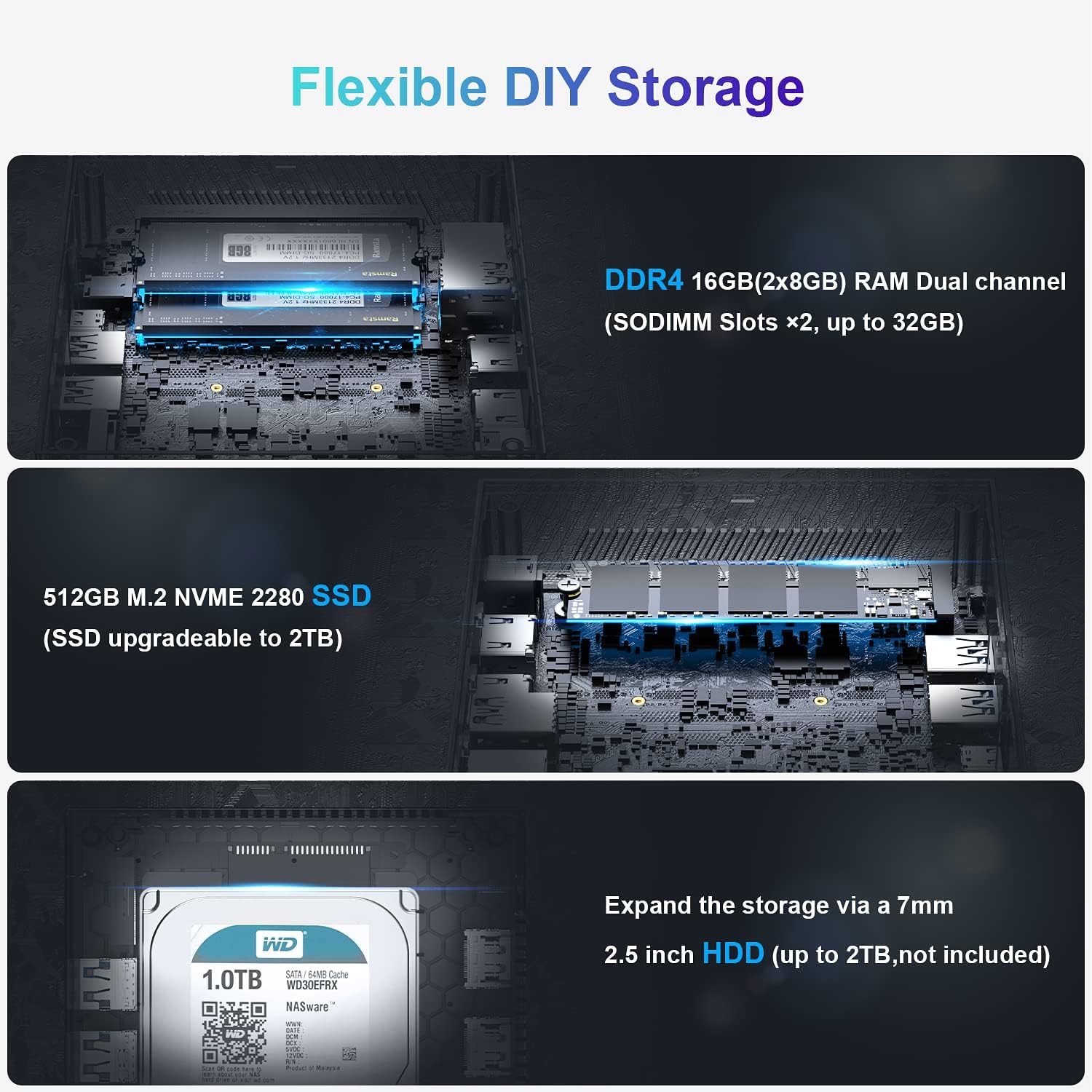 【Größerer Arbeitsspeicher & erweiterbarer Speicher】 Integrierter 8 GB LPDDR4 RAM, 256 GB M.2 SATA SSD (unterstützt bis zu 2 TB M.2 SATA3 SSD 2280/2,5-Zoll-SATA3-HDD, nicht im Lieferumfang enthalten). Unterstützt externe Festplattenerweiterung, DIY 2,5-Zoll-SSD/HDD (nicht im Lieferumfang enthalten) im abnehmbaren, leeren Sockel zur Speichererweiterung. Bis zu 2 TB. Einfaches Wechseln zwischen mehreren Anwendungen.