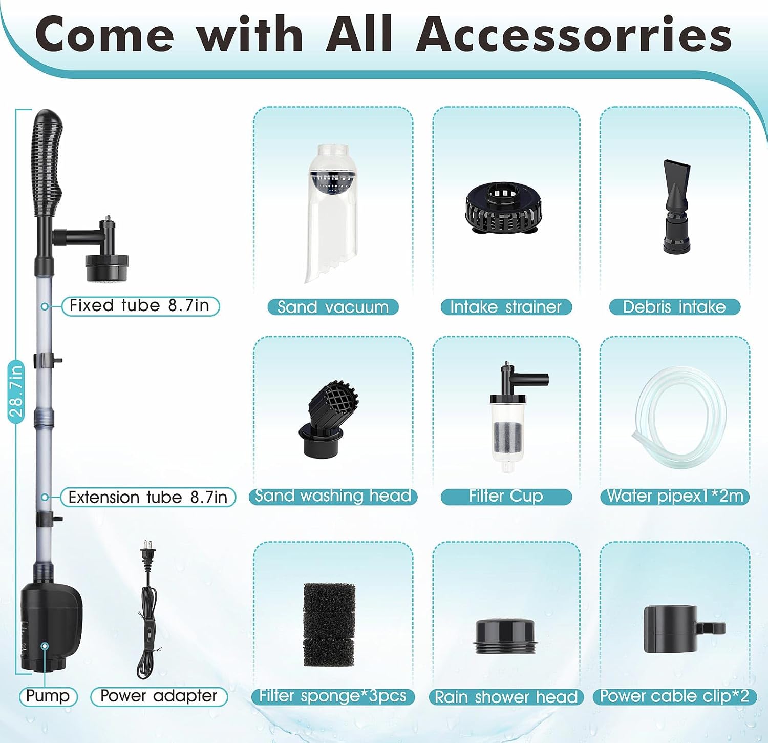 AQQA 【6-in-1-Reinigungsset】 Dieses Aquarium-Kies-Reinigungsset wird mit verschiedenen Aufsätzen geliefert, um bei Wasserwechsel, Kiesreinigung, Schmutzentfernung, Filtration, Wasserzirkulation und sogar Schildkrötenschauern zu helfen. Sie können zwischen verschiedenen Zubehörteilen wechseln, um diese Aufgaben auszuführen, ohne mehrere Werkzeuge zu benötigen.
