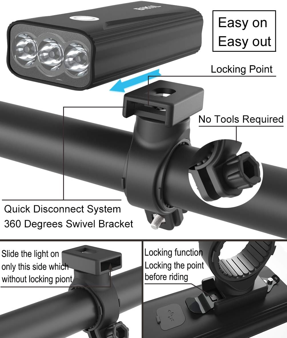 Robuste Halterung und einfache Montage/Demontage, 360 Grad drehbar. Sobald der Halter in eine bestimmte feste Position gedreht wurde, bleibt er dort und dreht sich nicht automatisch. Der Fahrradhalter ist sicher am Lenker befestigt und das Licht ist sicher an der Basis befestigt. Es fällt nach der Installation nicht ab. Sie können den Entriegelungsknopf gedrückt halten und die Lampe verschieben, ohne die gesamte Montagehalterung zu demontieren. Sekundenschnelle Montage und Demontage ohne Werkzeug!