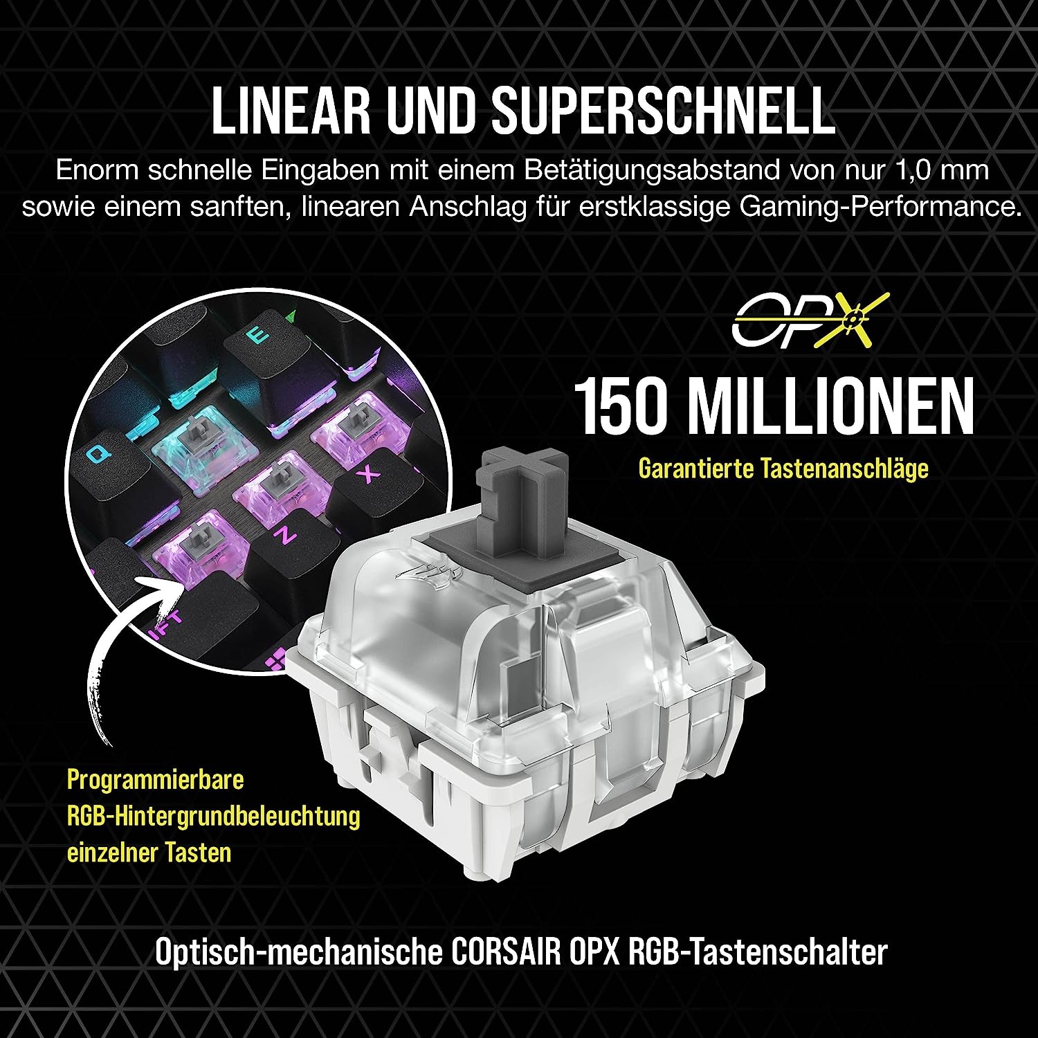 • CORSAIR OPX RGB optisch-mechanische Tastenschalter: Blitzschnelle Eingaben mit einem Betätigungsweg von nur 1,0 mm und einem leichten linearen Anschlag. 150 Mill Tastenanschläge garantiert werden.
