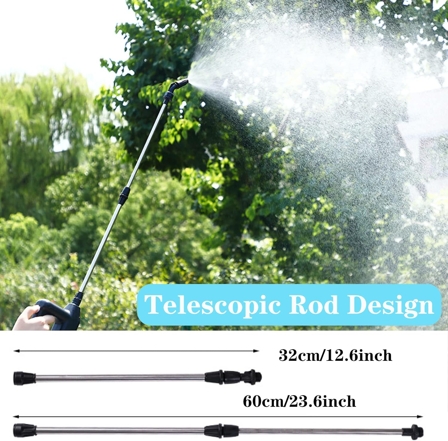 Teleskop-Verlängerungsstange: 2-stufige Teleskopstange – lässt sich von 23,6 Zoll auf 35,4 Zoll ausziehen und ist lang genug, um schwer erreichbare Stellen zu erreichen. Der Gartensprüher eignet sich zum Gießen von Gartenpflanzen, als Zimmerpflanzensprüher, zum Reinigen von Autos, zur Luftbefeuchtung, zum Reinigen von Glas usw.