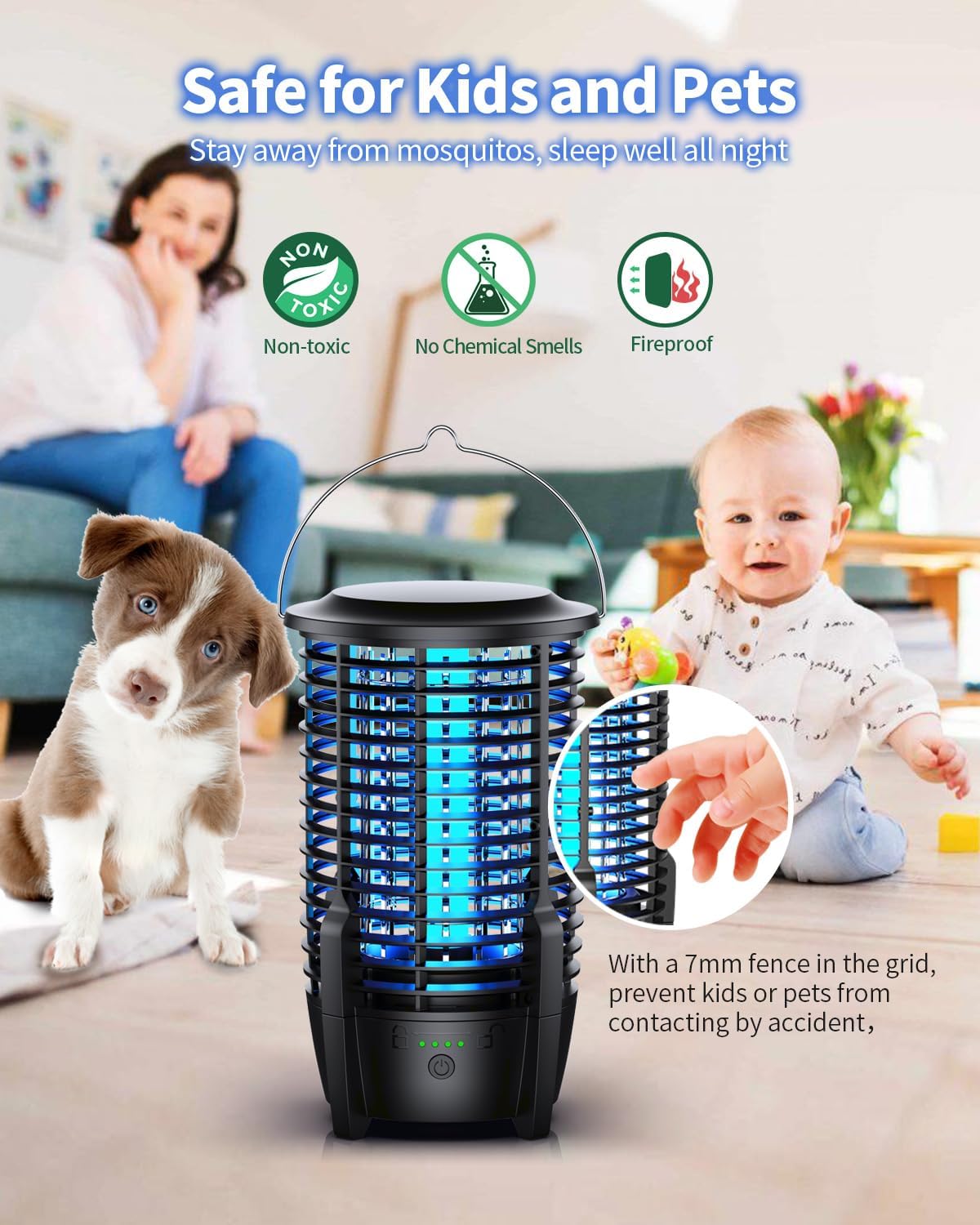 【3600-mAh-Akku mit hoher Kapazität】: 3600-mAh-Akku mit extrem großer Kapazität. Unsere elektrische Insektenvernichtungslampe bietet bis zu 10 Stunden lang kontinuierlichen Schutz vor Mücken und schützt Sie die ganze Nacht. Verabschieden Sie sich von lästigen Mückenstichen. Sie können die Mückenlampe über ein USB-Kabel aufladen. Die Ladezeit beträgt ca. 4,5 Stunden. Nach dem vollständigen Aufladen können Sie es mitnehmen und überall hinstellen, es sind keine Kabel erforderl【Sicherheit, frei von Chemikalien und extrem leise】: Die elektrische Mückenlampe funktioniert auf physikalische Weise, um Insekten zu vernichten. Keine Chemikalien, kein Geruch, kein Gift, keine Umweltverschmutzung. Kein Schaden für Ihre Gesundheit. Geräuschunterdrückendes Design, stört Ihren Schlaf nicht. Dieser wiederaufladbare Mückenvernichter ist mit einem Schutzgitter ausgestattet. Dadurch wird wirksam verhindert, dass Kinder oder Haustiere es versehentlich berühren