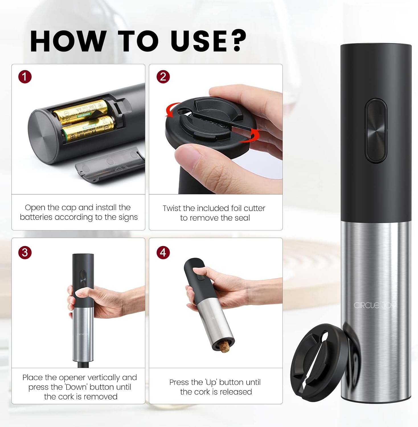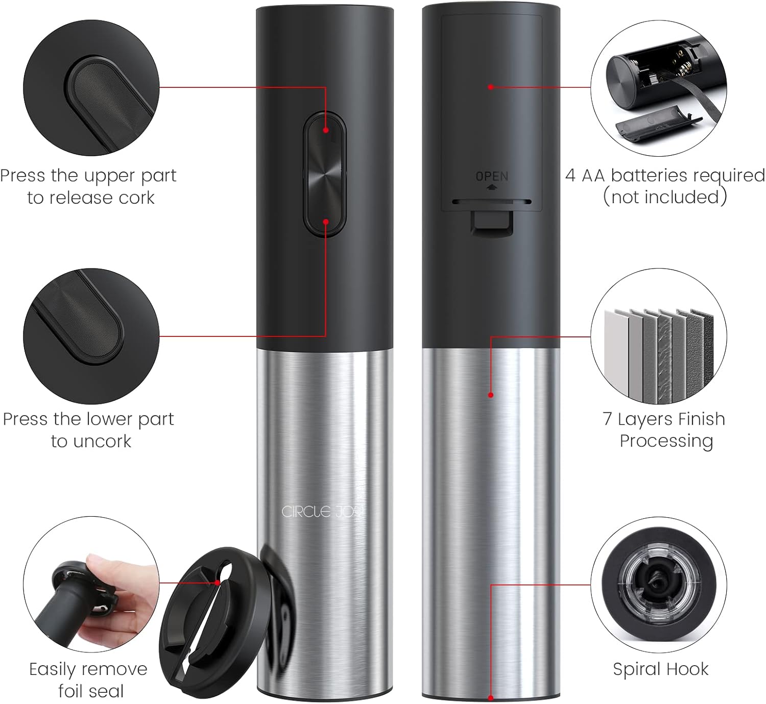 - Einfache Bedienung: Installieren Sie einfach zuerst die Batterien und drehen Sie den Folienschneider, um die Foliendichtung zu entfernen. Halten Sie dann den Weinöffner senkrecht auf der Oberseite der Flasche fest und drücken Sie den Extrakt-Knopf. Wenn der Korken herausgezogen ist, drücken Sie die obere Entriegelungstaste und er wird automatisch in Sekunden herauskommen.