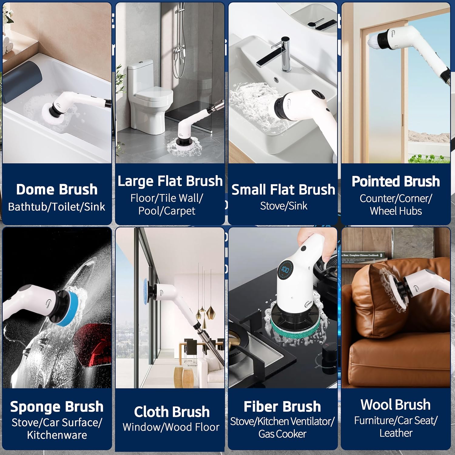 Elektrischer Spin Scrubber, 9-in-1-Akku-Reinigungsbürste mit USB-Anschluss Typ C, Ladegerät, 3 einstellbaren Geschwindigkeiten, LED-Anzeige, elektrischer Schrubber zum Reinigen von Badezimmer-, Badewannen- und Fliesenböden