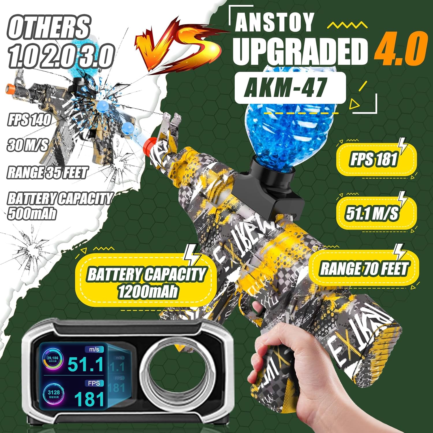 • [Anstoy Gel Gun Blaster] Dieser Gelkugelblaster ist ein neuer Stil, der von Anstoy entworfen und produziert wurde. Der Motor wurde für eine bessere Stabilität aufgerüstet und verbessert. Diese Spritzpistole lädt sehr schnell auf und hält länger.