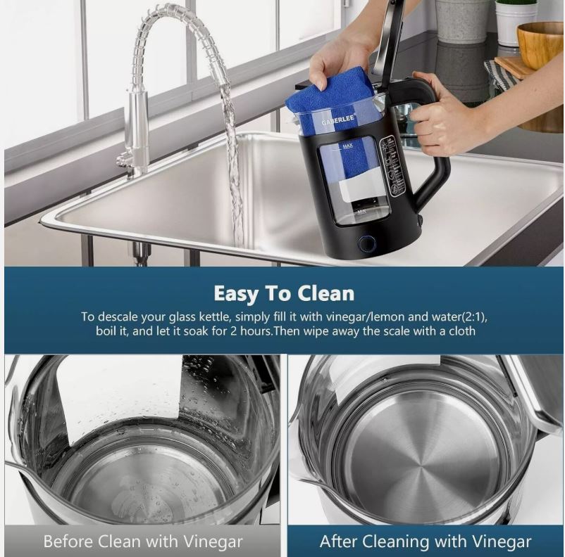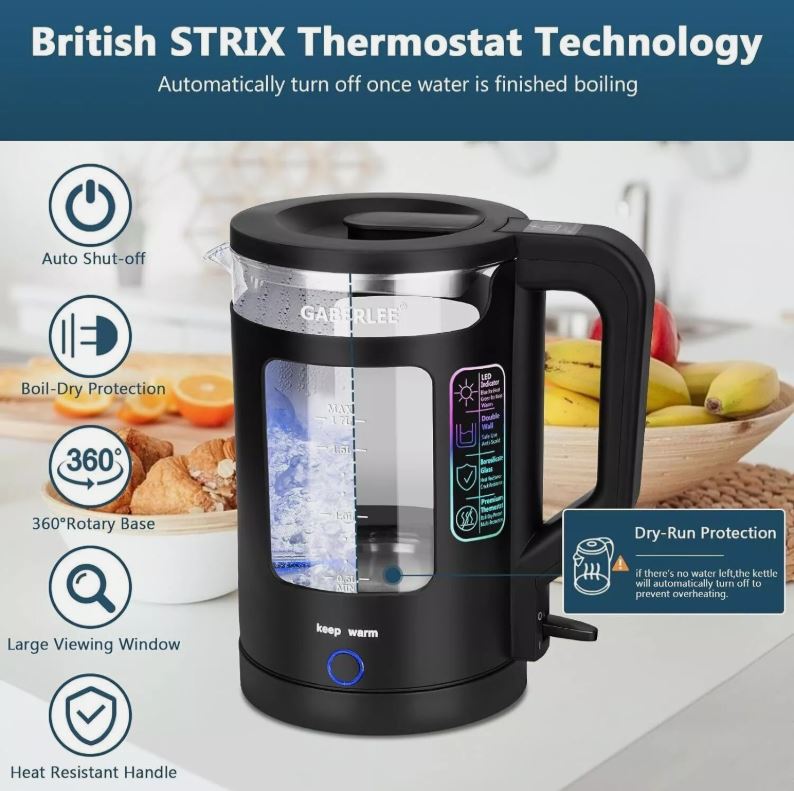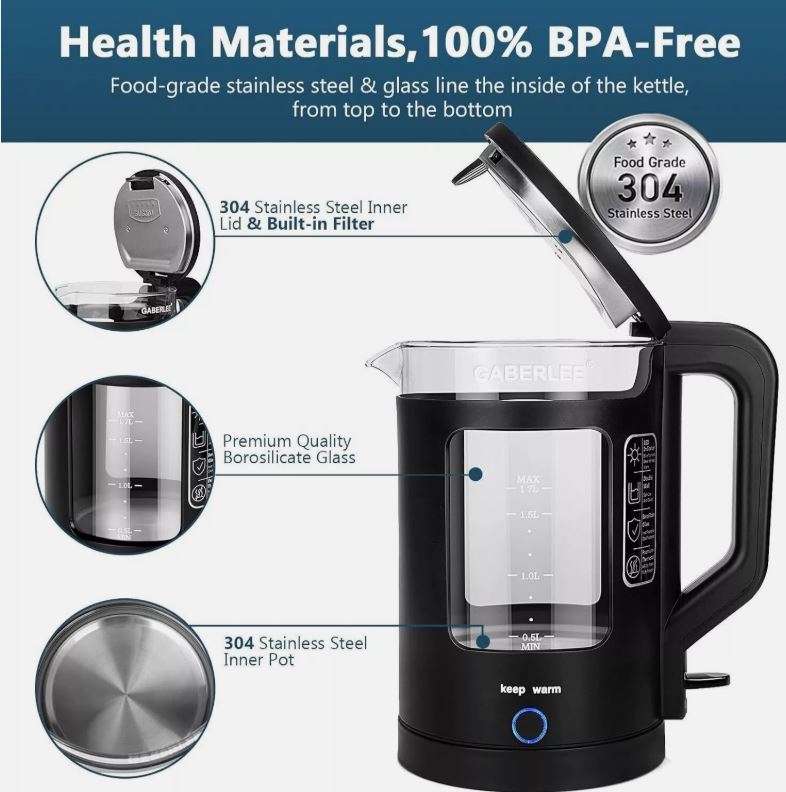 GABERLEE Wasserkocher, 1,7 l Fassungsvermögen, 1500 W, schnell kochend, leises Glas, blaues Licht