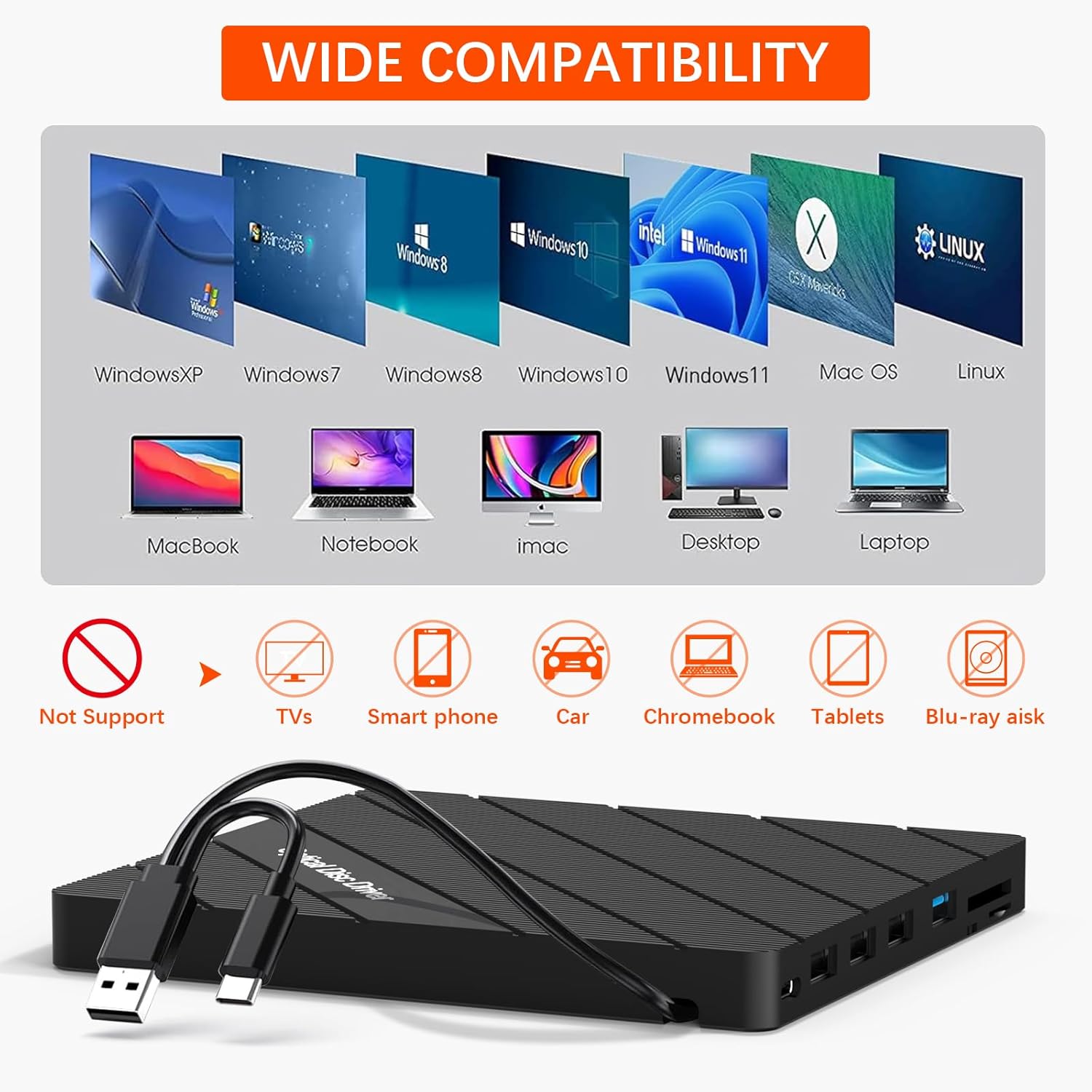 Multifunktionaler 8 IN 1 USB-Hub mit externem CD/DVD-Laufwerk: Lesen und Brennen von CDs/DVDs, sowie 4 USB-Anschlüsse, TF- und SD-Karten-Slots und einem USB-Typ-C-Port für zeitgleiches Laden und Datentransfer. Kompatibilität mit USB-Festplatten, Mäusen, Tastaturen und weiterem Zubehör. Das Laufwerk bietet eine verbesserte Leserate und eine stabilere Leistung.