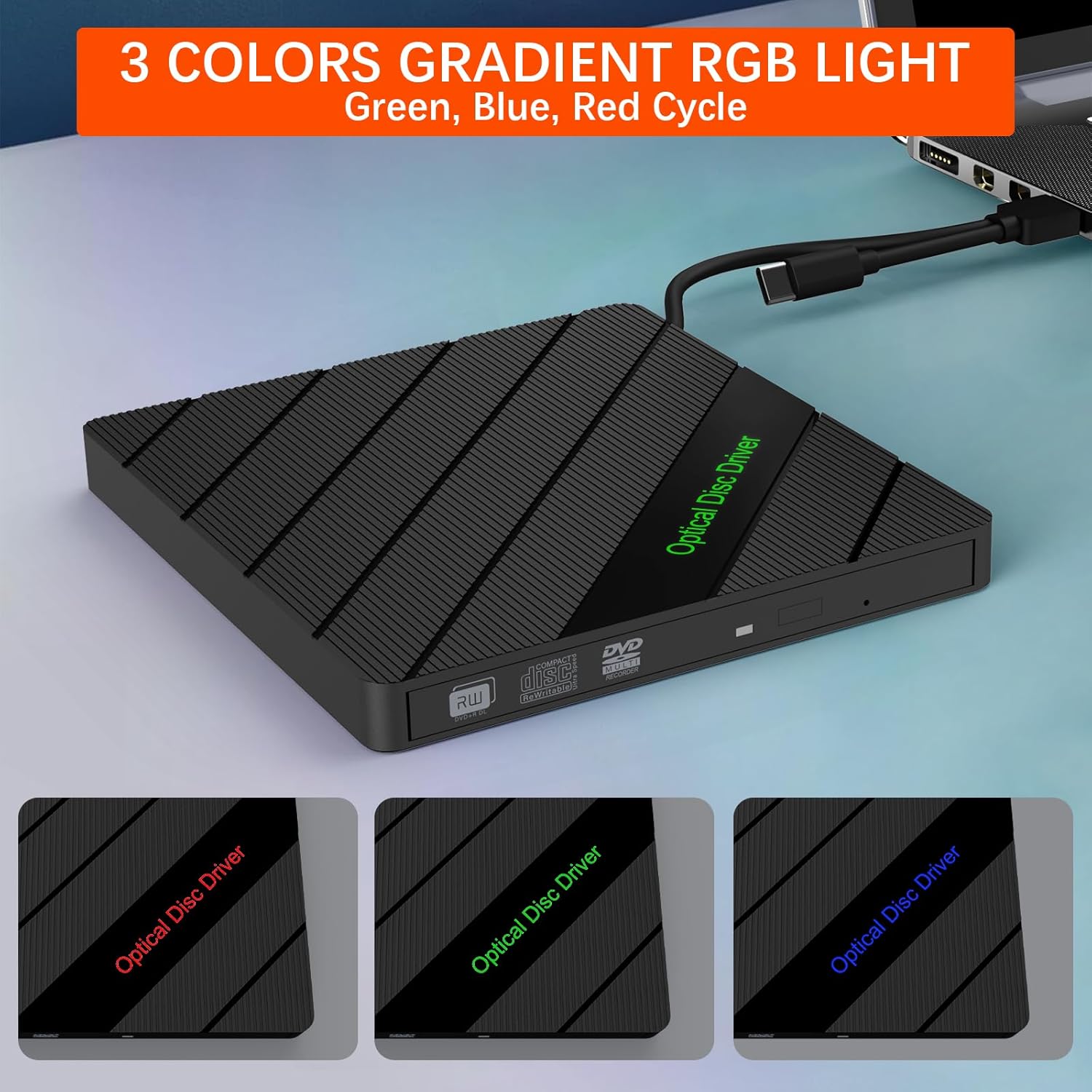 Unser CD-Laufwerk besticht durch sein dreifarbiges Licht, das für eine ansprechende Optik bei der Verwendung sorgt. Im Vergleich zu anderen externen CD-/DVD-Laufwerken fällt es besonders durch das schicke Design ins Auge. Durch die praktische Ein-/Aus-Taste am Laufwerk hast du jederzeit die Möglichkeit, das Licht ein- und auszuschalten.