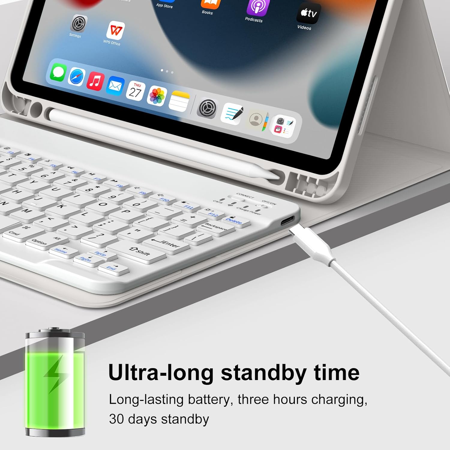 ➤【Langlebige Batterie 】 Eingebauter Premium-Li-Ionen-Akku mit Energiesparmodus, das Keyboard Case mit Typ-C-Ladeanschluss, 2-3 Stunden volle Ladung, arbeitet mindestens 3 Tage lang. Um die Batterie zu schonen, schaltet das Smart Cover Ihr iPad automatisch in den Ruhezustand, wenn es geschlossen ist.
