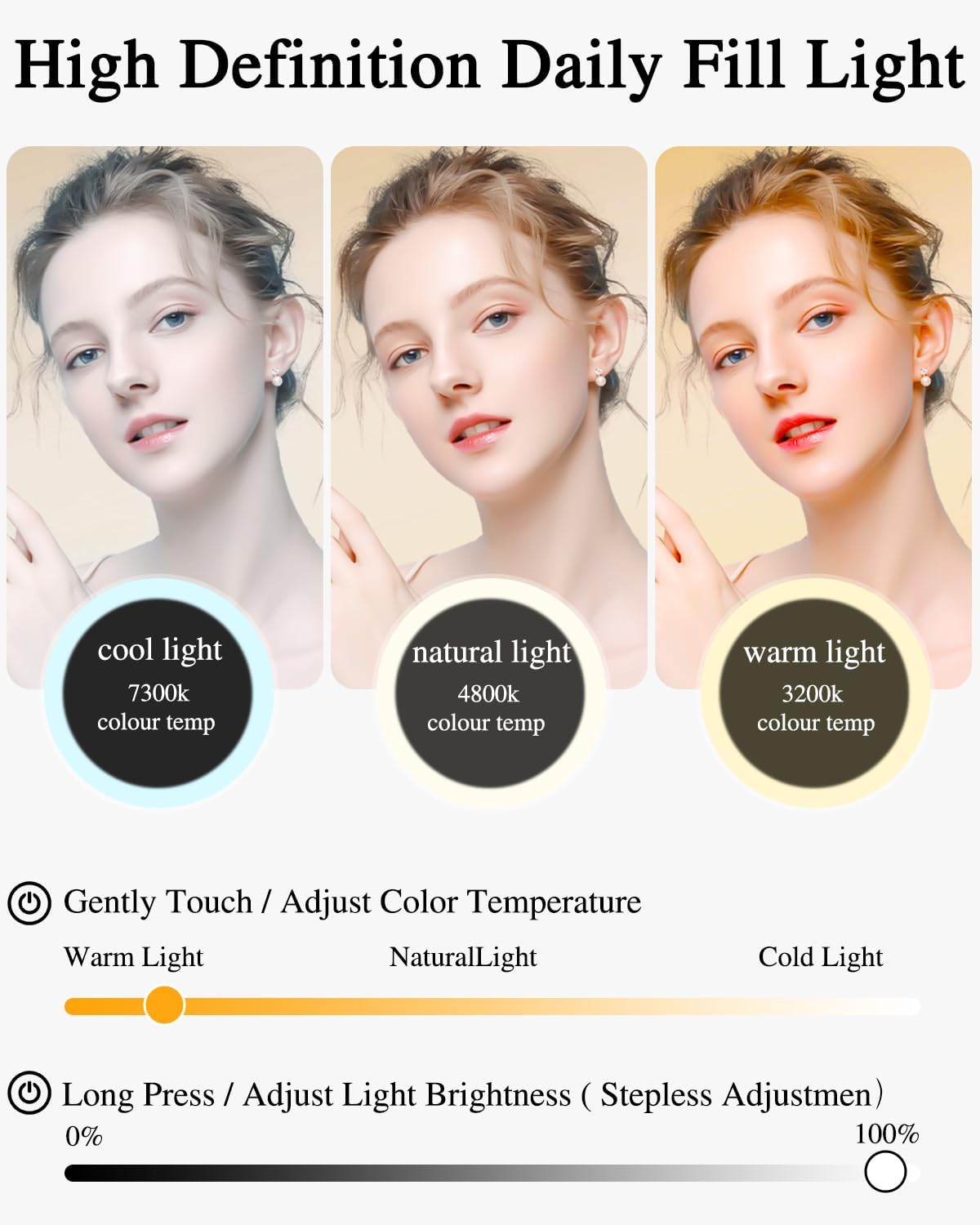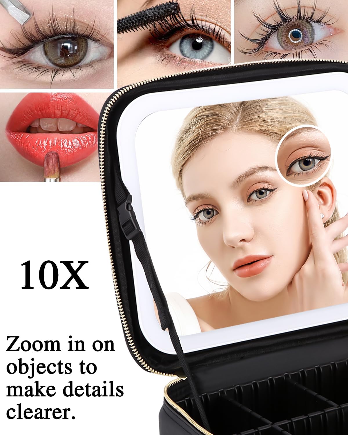 Kosmetiktasche mit LED-Beleuchtung: Diese geräumige Kosmetiktasche verfügt über einen abnehmbaren Kosmetikspiegel und einen 10-fach vergrößernden Spiegel. Die Helligkeit des Spiegels ist einstellbar und bietet weißes, warmes und kaltes Licht. Ein kurzer Druck auf den Sensorschalter ändert die Lichtfarbe, ein langer Druck passt die Helligkeit an.